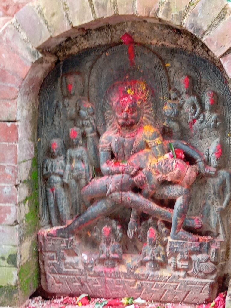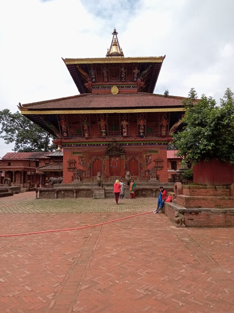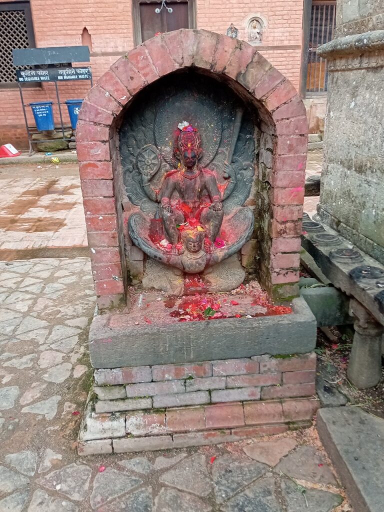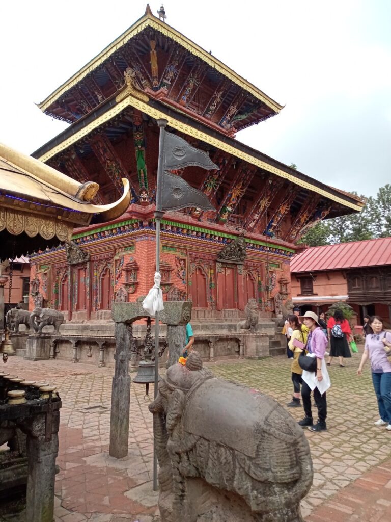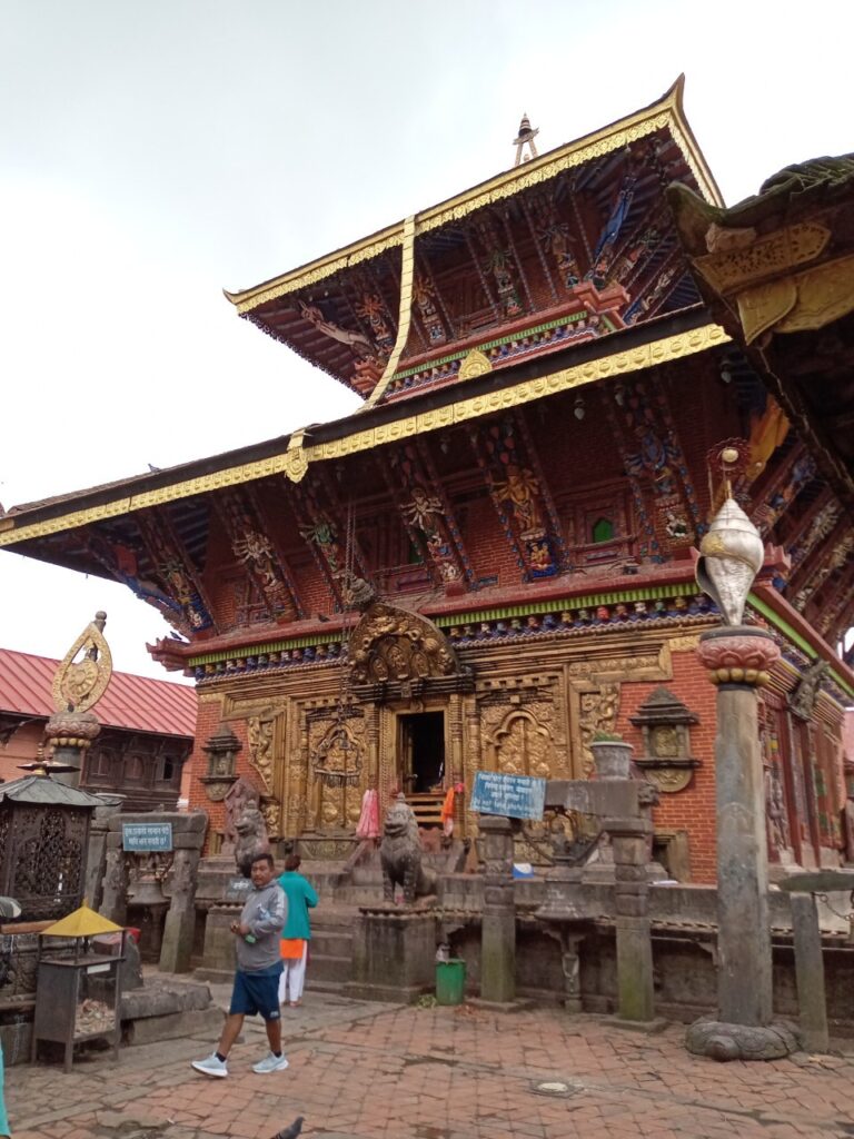 そして、チャング・ナラヤン寺院の入口に。小さな門前町や食堂を通り抜け、石段を登ったところに赤レンガ積みの建物に囲まれた境内があります。ここは、ヴィシュヌ神の化身であるナラヤン神を祀る、ネパール最古のヒンドゥー寺院だそうで、世界遺産にも登録されています。