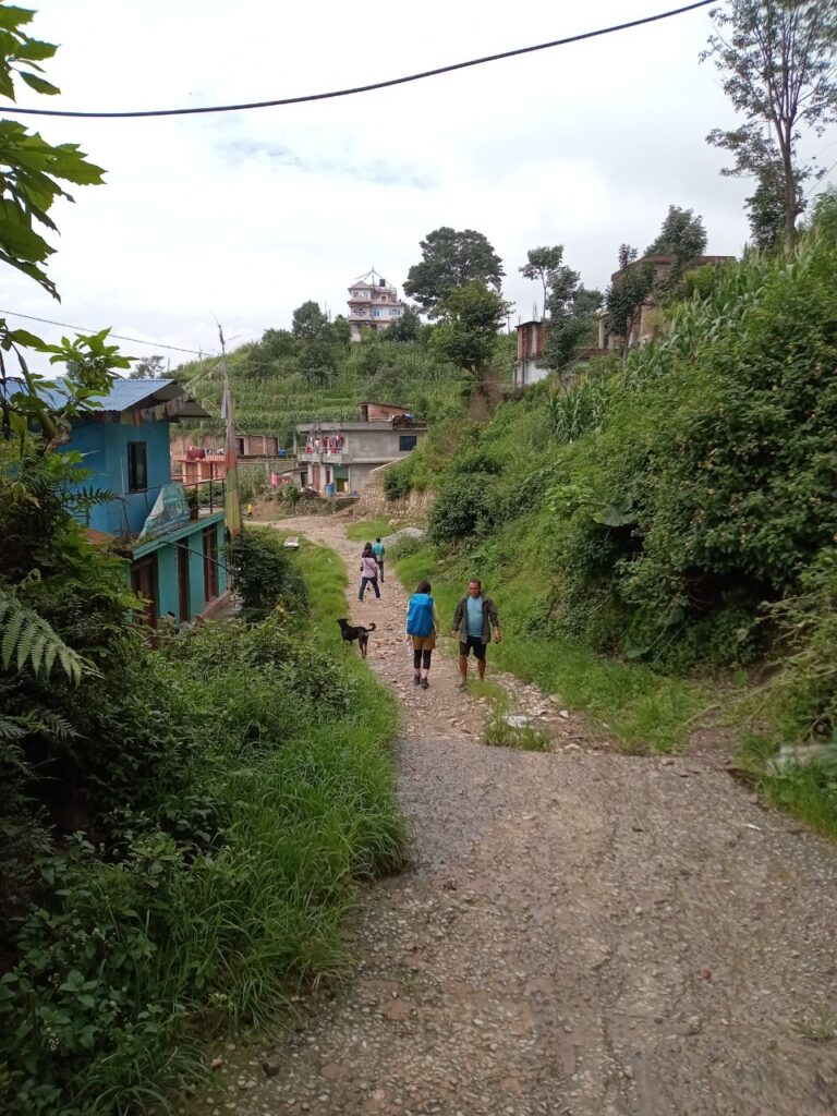 ナガルコットの警察署からチャング・ナラヤン寺院を目指して行きます。ネパールでのトレッキングということで、身構える感じがしますが、普通のハイキングのイメージで全然問題ありません。舗装はされていませんが、普通のスニーカーで歩くことができますし、下りも多いので、適度に休憩を入れていけば苦しくないと思います。ただ、ヒルがいるのであまりにも軽装過ぎるといつのまにか、噛まれているということがあるかもしれません(実際にツアーに参加している中のお一人がヒルに噛まれて出血を)。