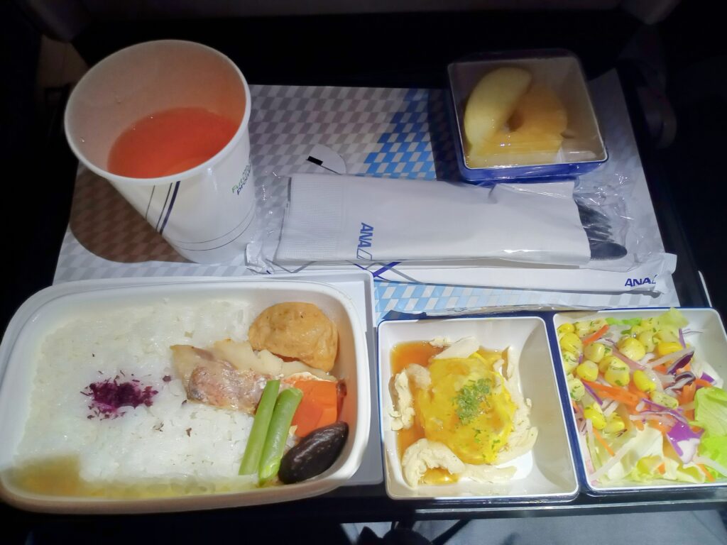 深夜に羽田を出発して、2日目は機内で迎えます。朝食は機内食。焼魚の方を選択していただきました。