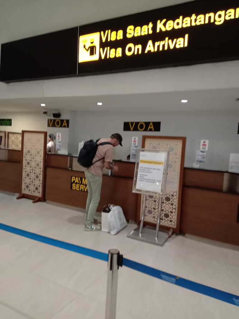そして、予定よりも少し早めの5:00前にジャカルタのスカルノハッタ空港に到着しました。湿度が高い!飛行機を降りたら、列に沿って移動します。そして、アライバルビザのカウンターに並んでビザを取得します。自分の前に2組しかいなかったのに、20分以上かかりました。費用は513500ルピア(手数料込み)でした。出国する際のフライト日、この後どこに行くかを聞かれたり、連絡先のメールアドレスを打ち込んだりすることはありましたが、それほど困ることはありませんでした。