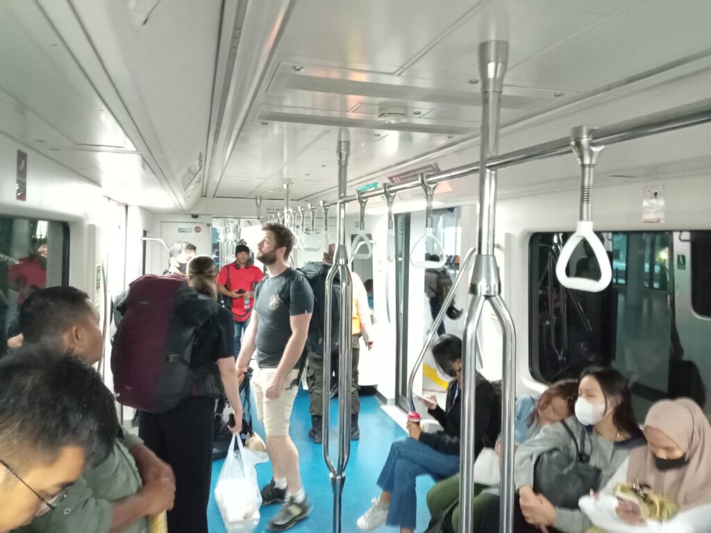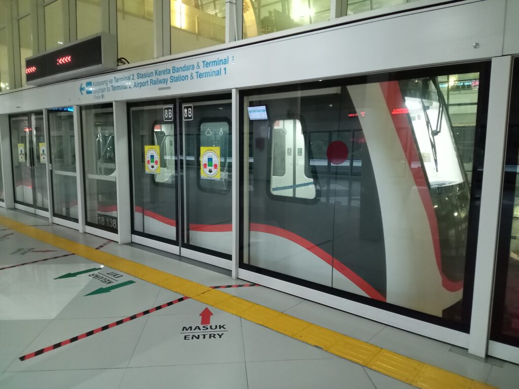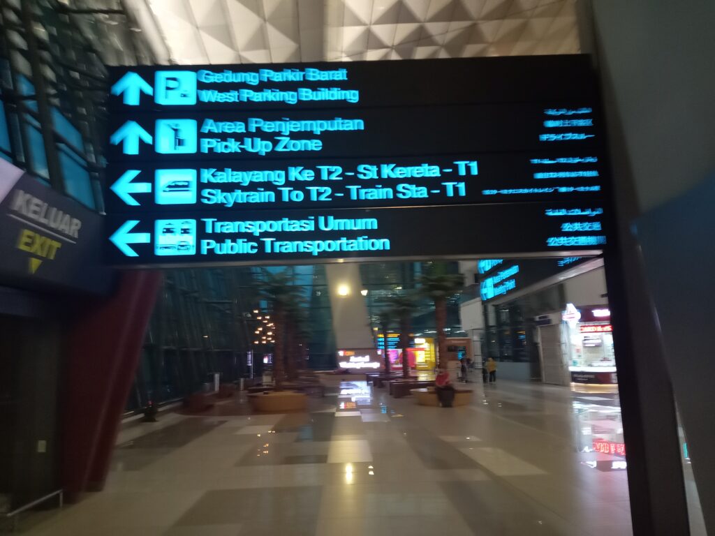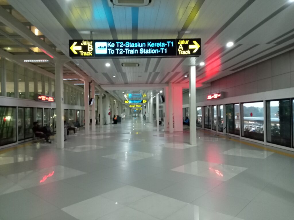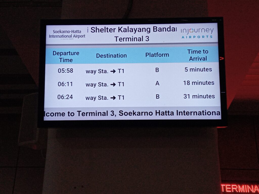到着したのは、第3ターミナル。次のジョグジャカルタまでの飛行機は、第2ターミナルなので、無料のスカイトレインで移動します。ターミナルを一旦出て、左にエスカレーターがあるので、それに乗れば乗り場に着きます。電光掲示板もあるので、何分後に出発かもすぐに確認できます。