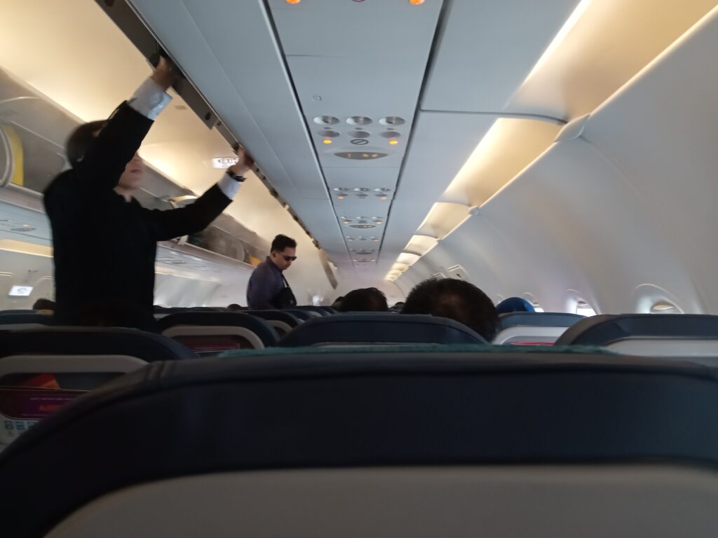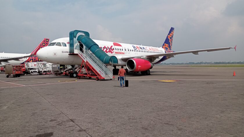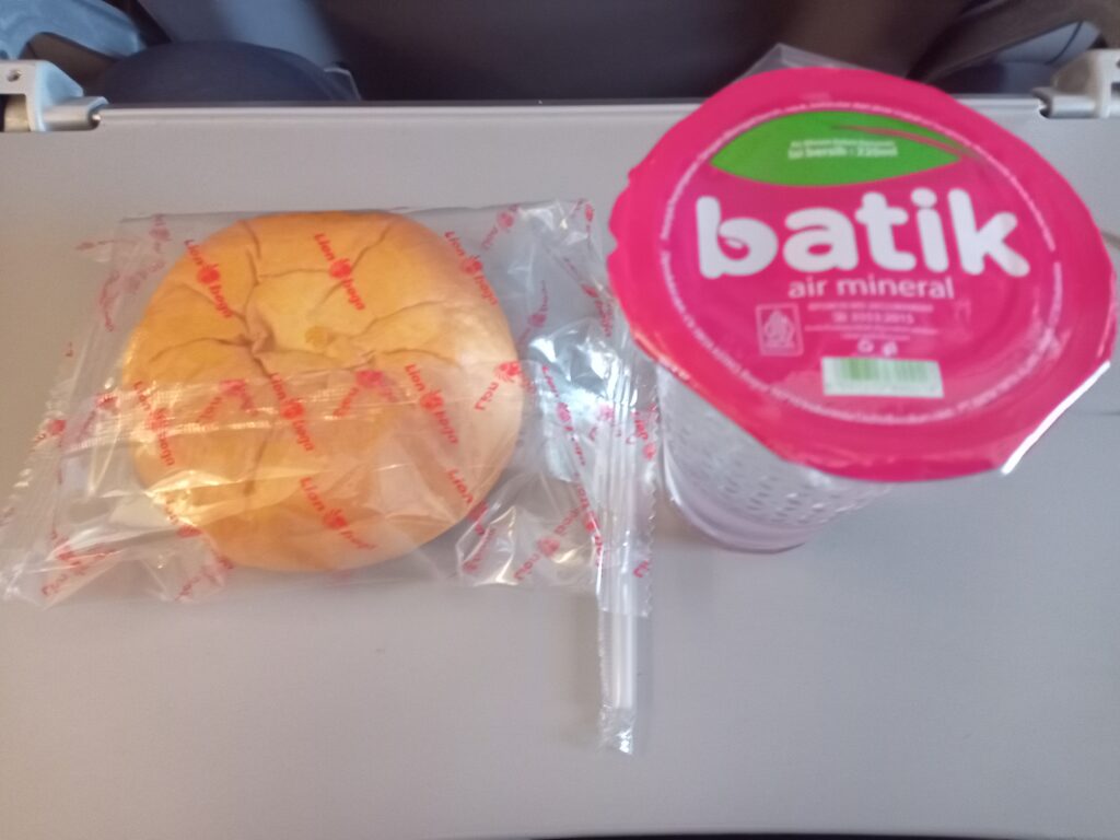 そうこうしている内に出発時刻。9:50発ジョグジャカルタ行きの便に乗ります。機内に入ると、白い蒸気が(写真では分かりにくいですが)。空調らしいですが、なんかドキドキします…。やや狭い機内ですが、フライトは約1時間なので気になりません。軽食(パンと水)が出ていましたが、いつ離陸したかも気づかず爆睡してジョグジャカルタに着きました。