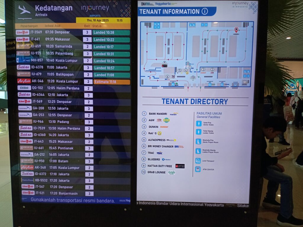 ジャカルタからジョグジャカルタ国際空港に到着したのは、11:00頃。定時出発で早く着くことができました。国内線なので、特に手続きなどはなく、預け荷物を受け取るだけです。ところが、なかなか出てきません。受取場所が3箇所あるのに、同じ場所で4便分の荷物が…。結局45分ほどで出てきました。