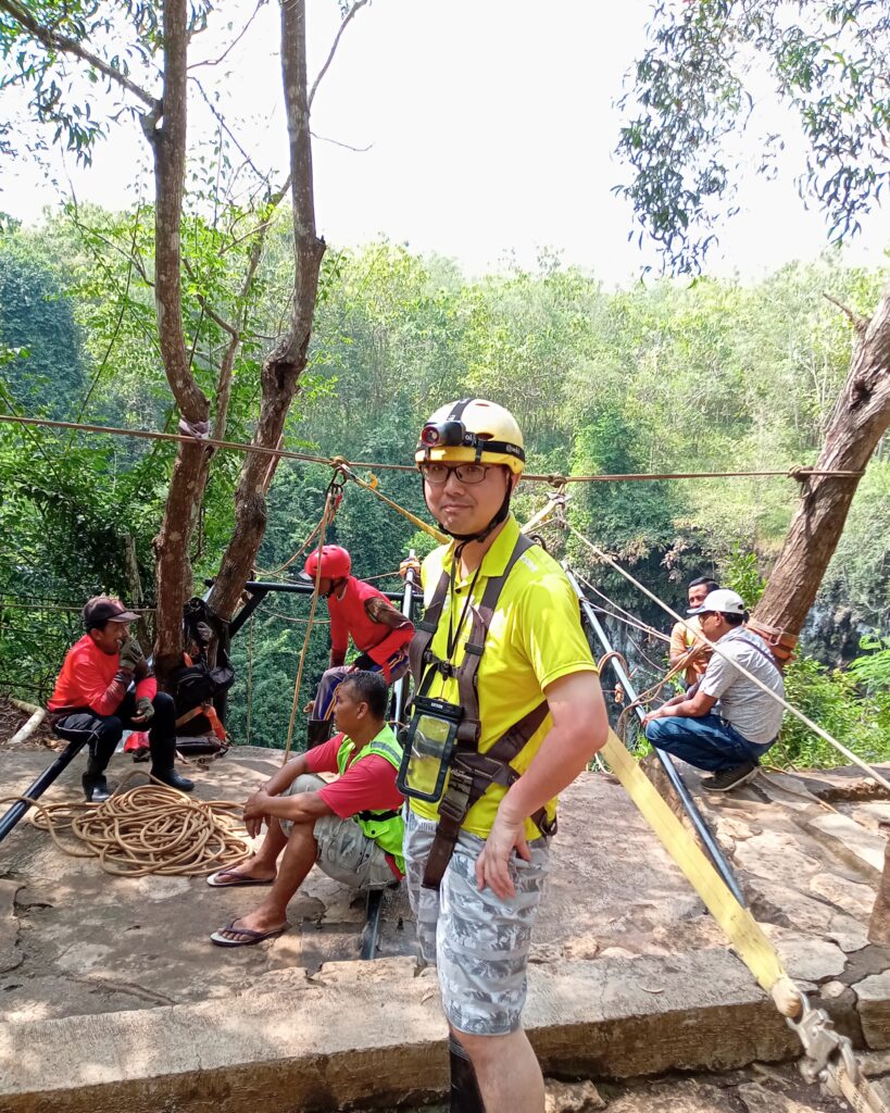 穴の入口となる場所で説明を受けたら、順番にハーネスをつけて、2人ずつ(私は1人で)40mを一気に降下します。