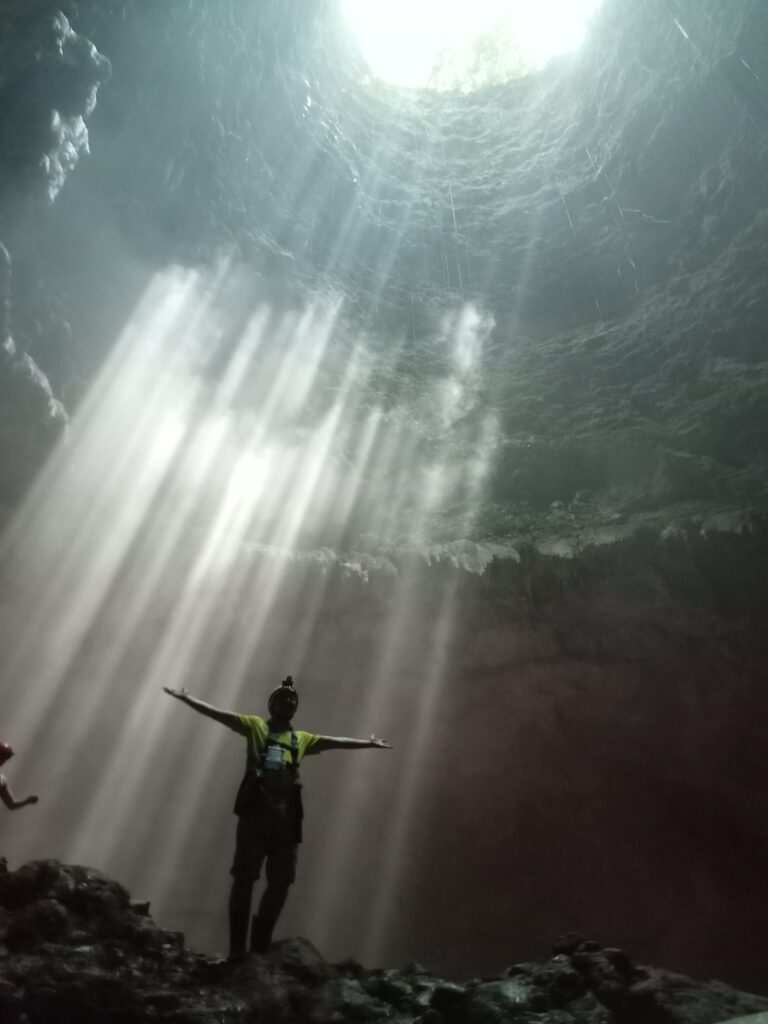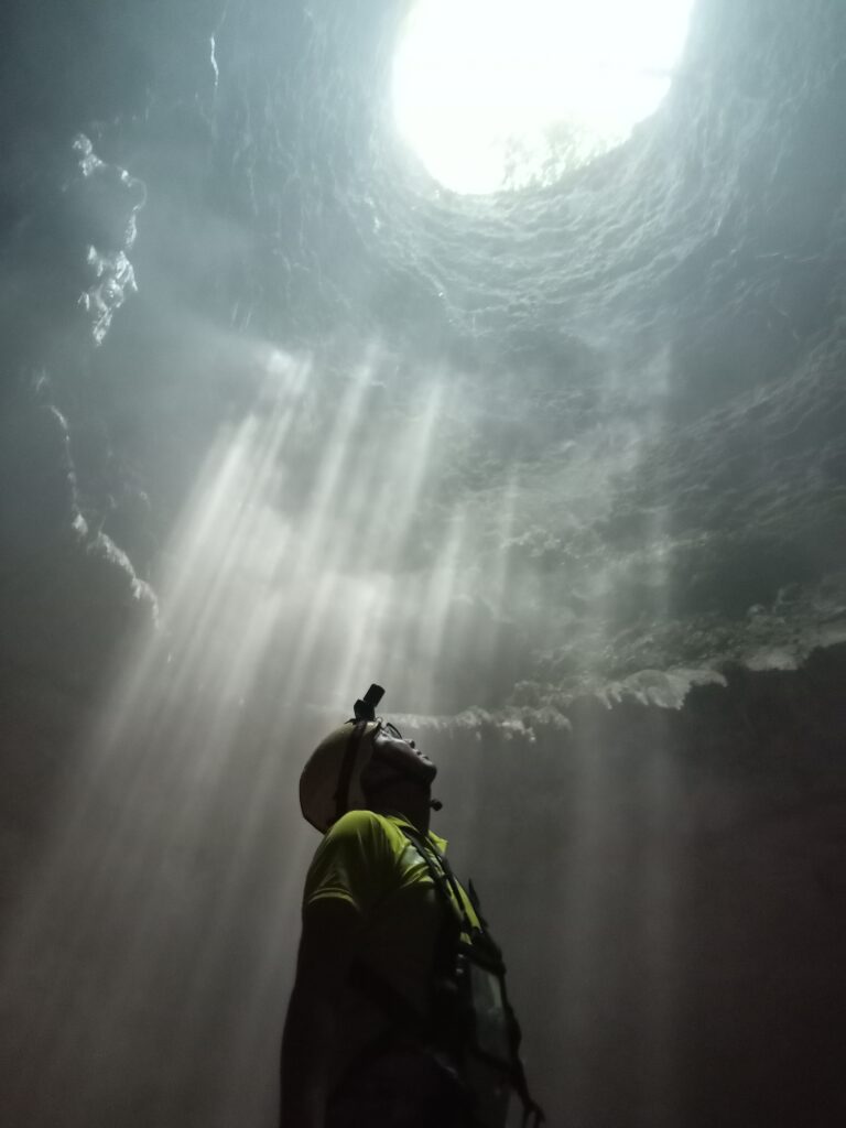 暗闇を進むと、縦穴のあるポイントに到着します。すると、上から光が差し込み、通称「太陽の糸」や「天国の光」と呼ばれる現象を体験をすることができます。何とも幻想的な瞬間です。