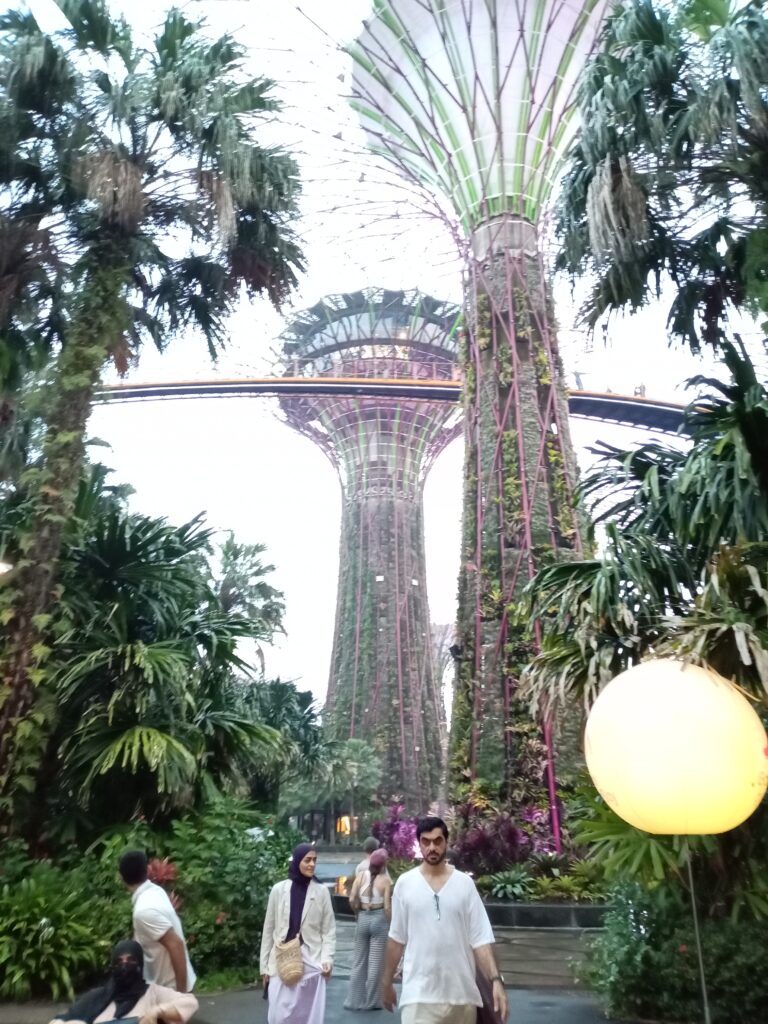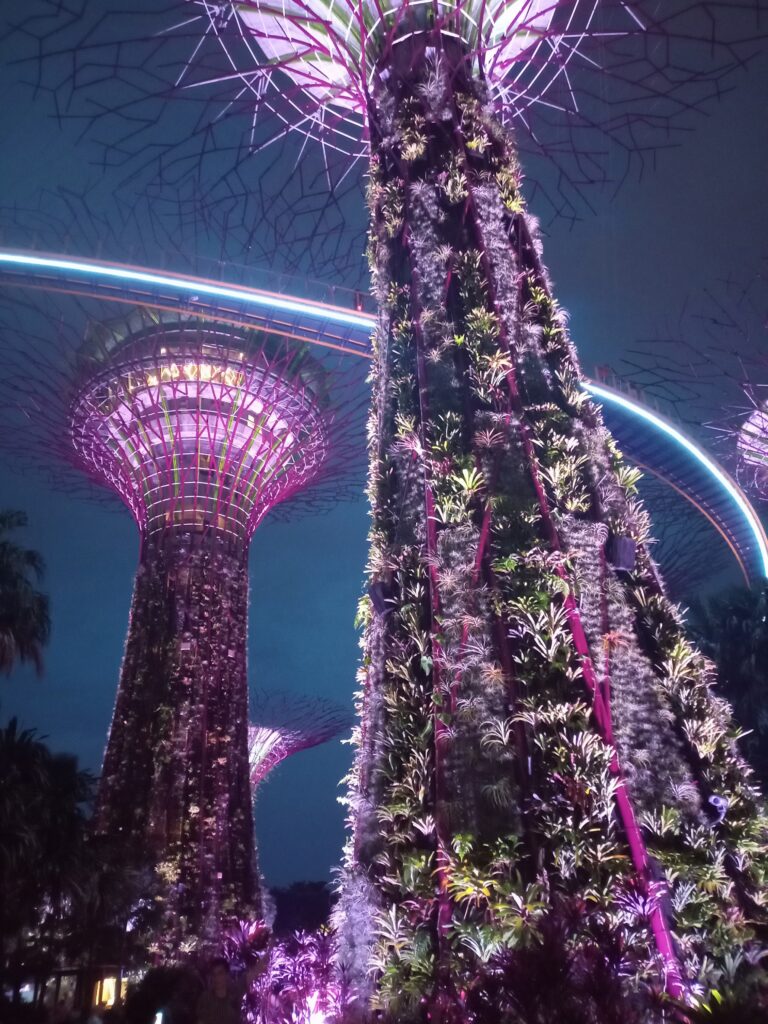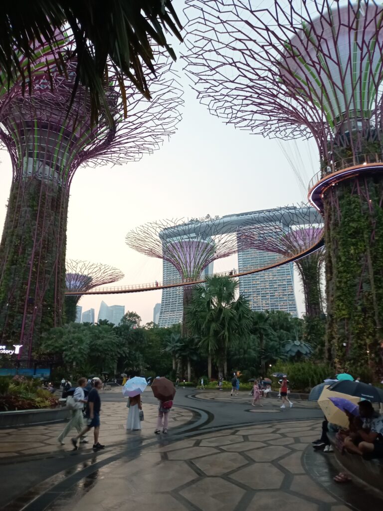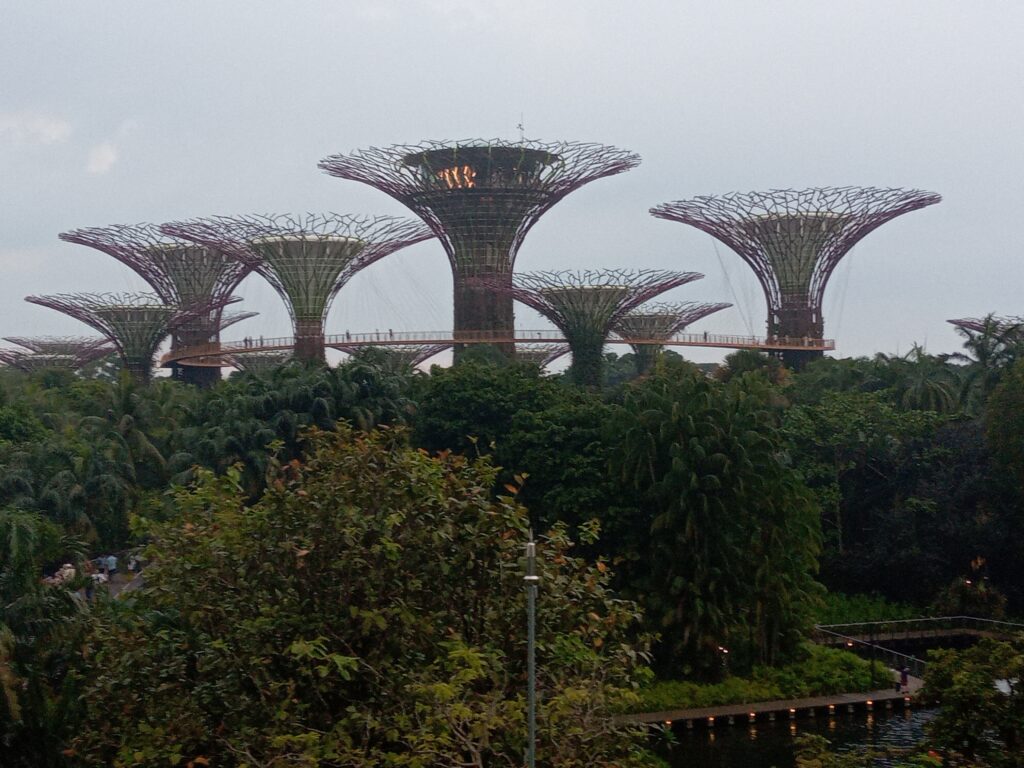 連絡橋を渡って、ガーデンズ・バイ・ザ・ベイの方へ行きます。ここは、熱帯雨林の巨大樹をイメージしたスーパーツリー群です。夕暮れが近づき、雰囲気もどんどん素敵に。遠方から見るマリーナベイ・サンズもいいですね。