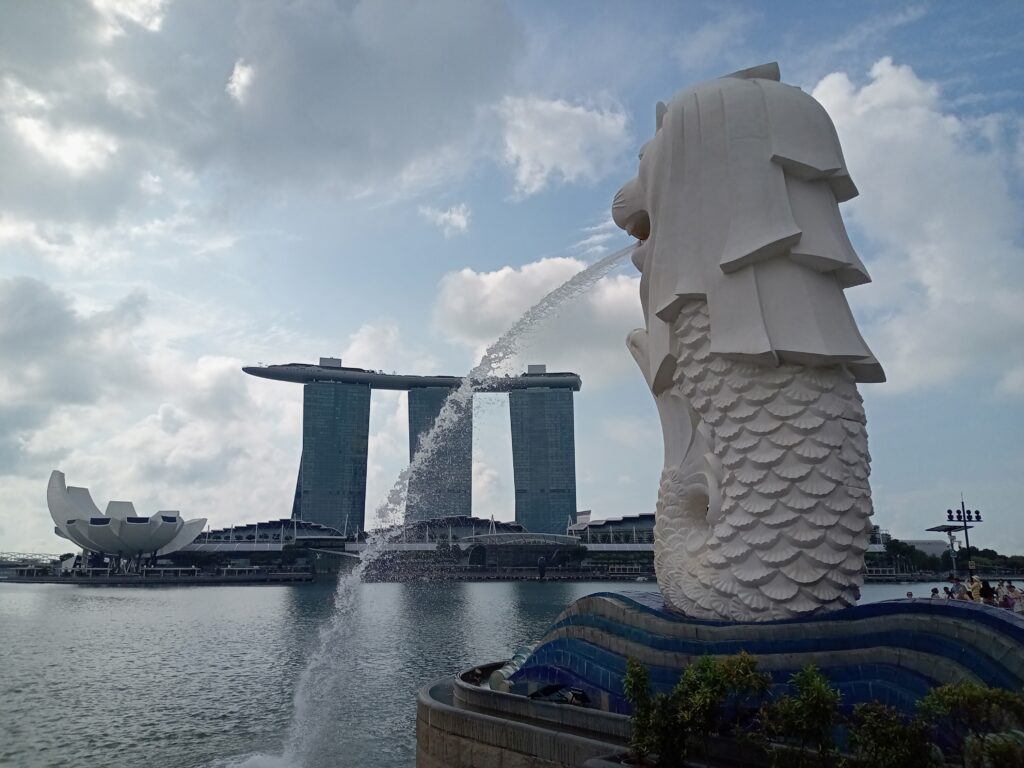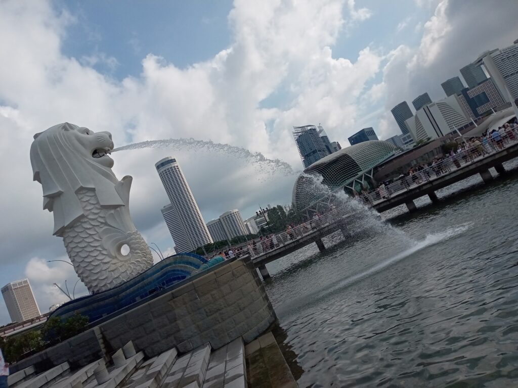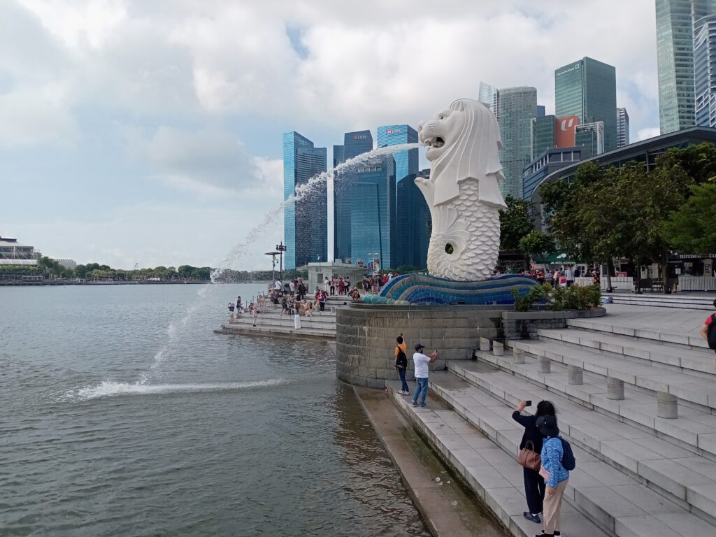 ガイドブックと睨めっこして決めたのは、比較的近くにあるマーライオン・パーク。歩いて、公園に向かいます。15分くらい歩いて公園に到達。前日に訪れたマリーナベイ・サンドの対岸にあります。