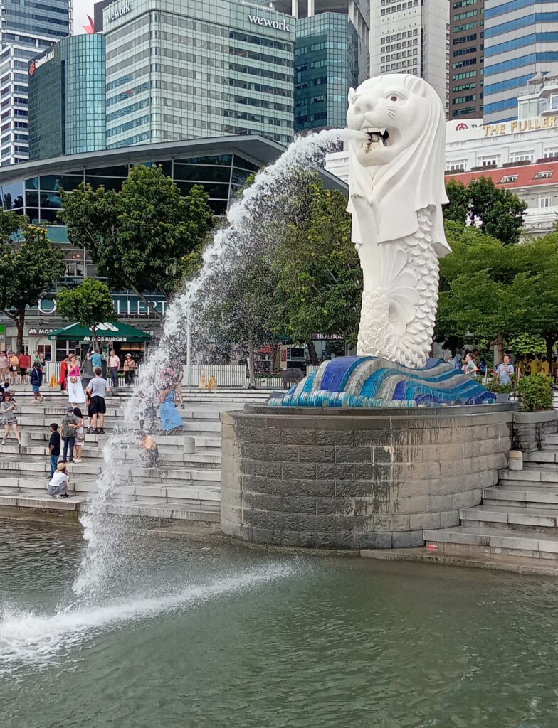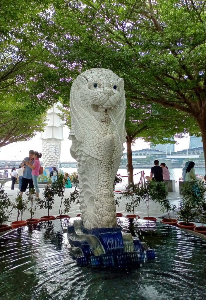 マーライオンの周りには、記念撮影をする人で溢れています。また、背後の方には、ミニマーライオンの像もあります。