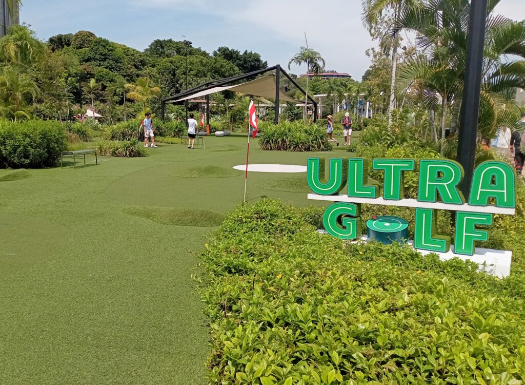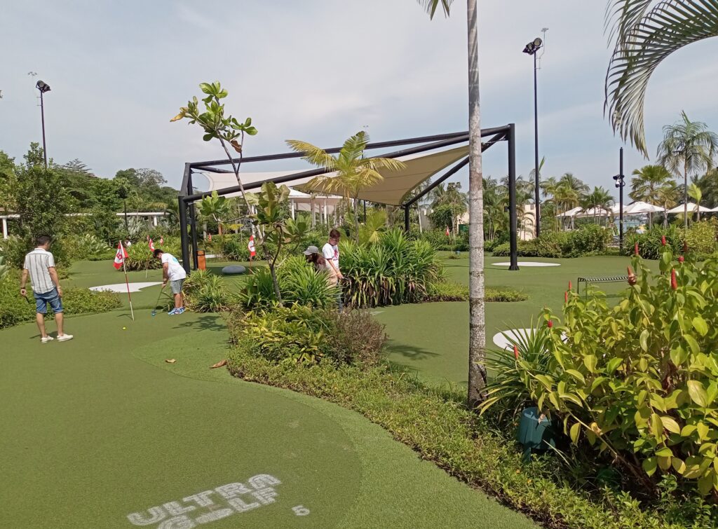 吊り橋を再び渡ってビーチ側に戻った後、シャトルバスで少しだけ引き返して、ウルトラゴルフというものに挑戦。ビーチサイドにある特設コースでやるパターゴルフです。パー2、パー3で設定されていますので、コレがなかなか難しい。