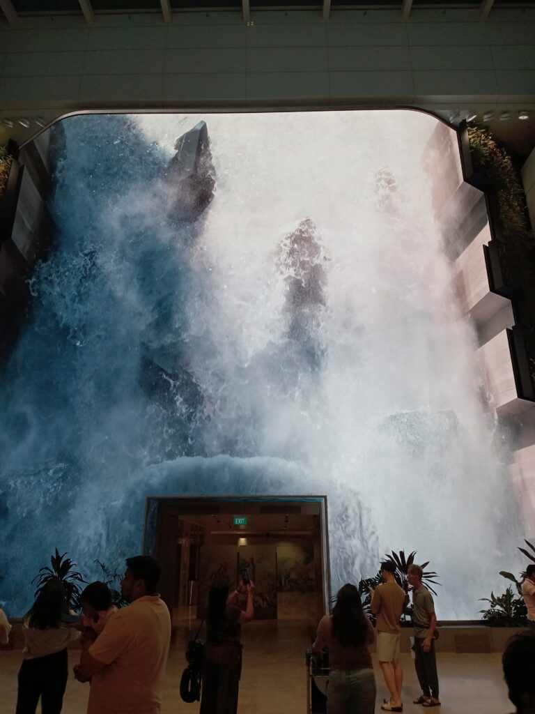 シンガポール(チャンギ国際)空港に着いたら、まずはチェックインです。到着地と同じ第2ターミナルの機械でチェックインと荷物を預ける作業を済ませます。下の写真はチェックインした場所のすぐ近くにある滝の映像。ここの空港は、随所にいろんな工夫が見られます。