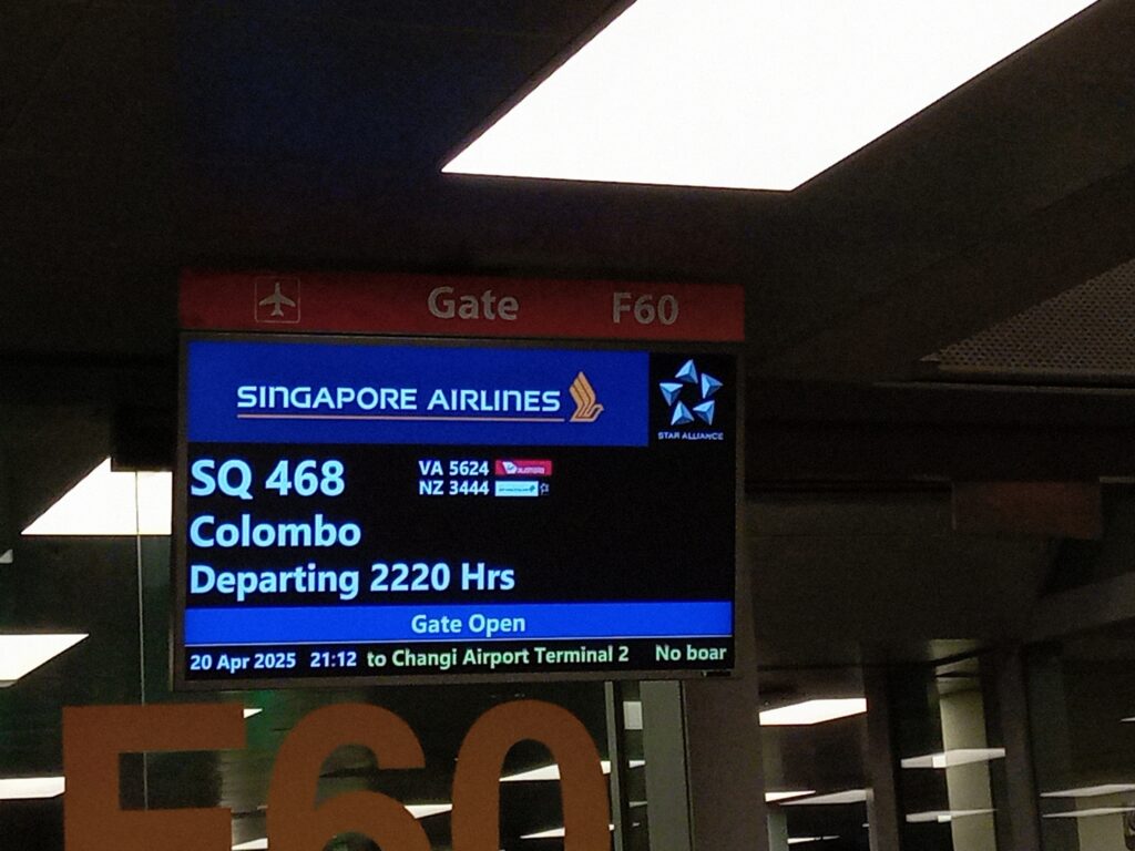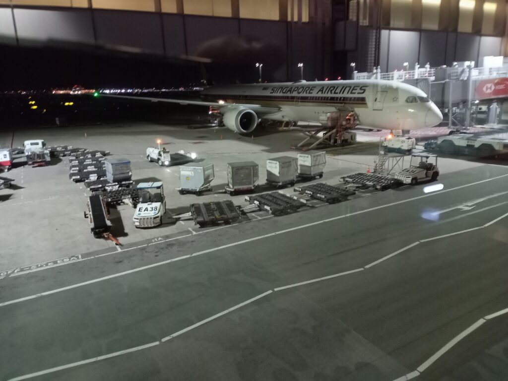 いよいよフライト。搭乗口手前で保安検査を済ませて、飛行機に乗ります。インドネシア(ジャカルタ)ーシンガポール線と同じ、シンガポール航空でのフライトです。今回は、4時間近くのフライトなので、前回の映画の続きに加えてもう一本見て過ごしました。