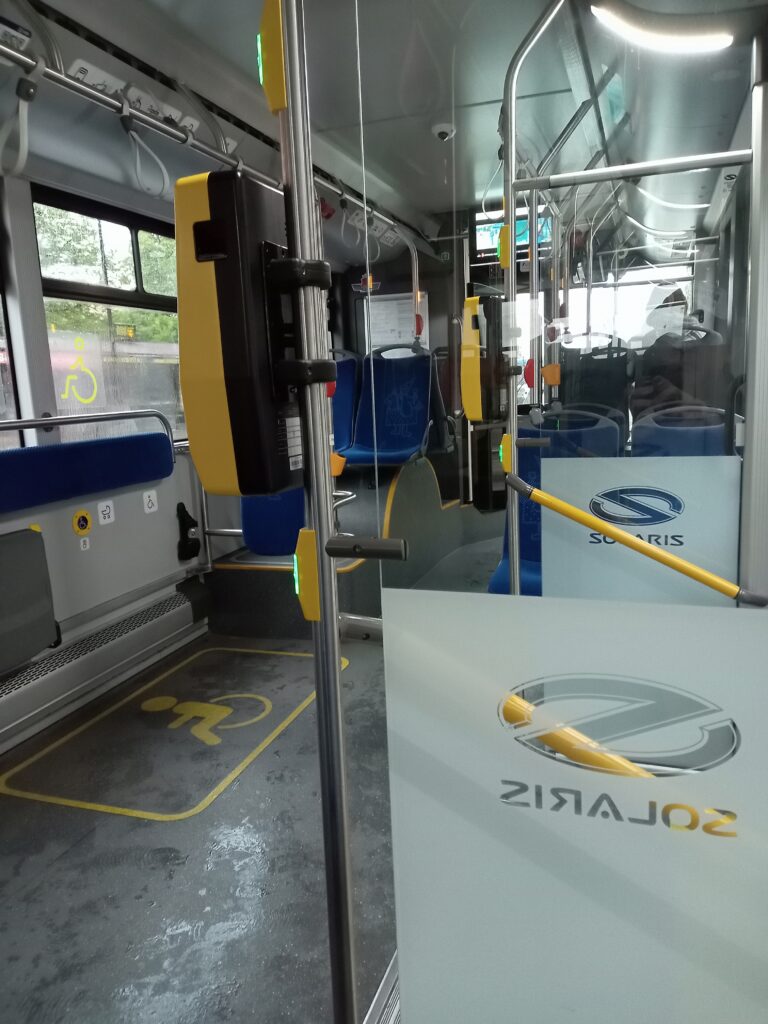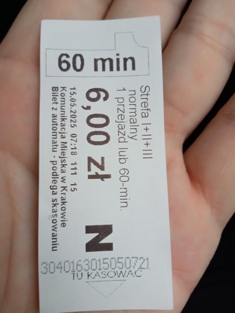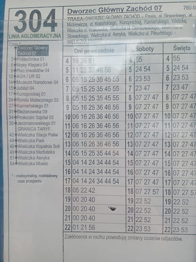 クラクフ本駅の西側出口を出たところに、すぐバス停があります。バスの番号は304。時刻表を見ると、平日はかなりの本数が出ているようです。バス停横の券売機で60分券を買い、バスに乗車(バスの中にも券売機があるので買うことは可能)。乗車したら、黄色の改札機に切符を通します。改札しないと、検札でバレた時、容赦なく罰金を取られます。
