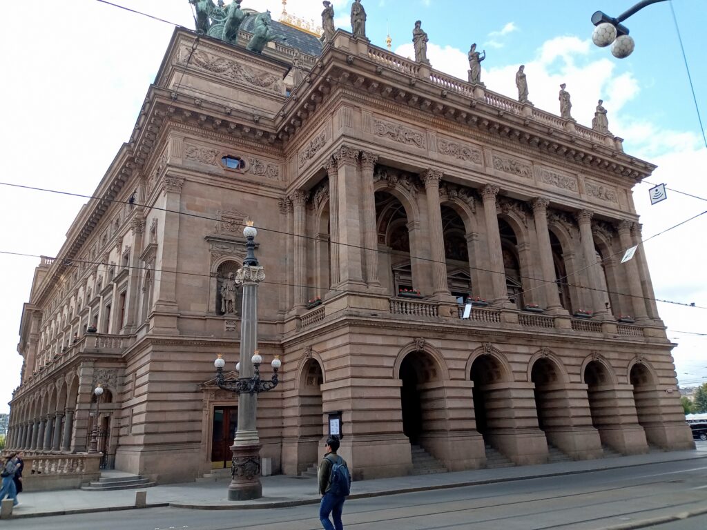 まずは、宿のすぐ近くにある国立オペラ劇場(外観のみ)。もとはチェコに住むドイツ人が「ドイツ人たちの劇場を」という隠れたスローガンのもとに造った劇場のため、ドイツ劇場とも呼ばれていたそう。外壁には豪華な装飾がされていました。