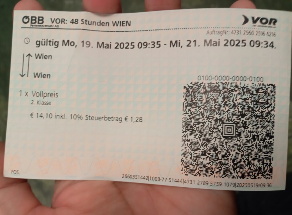 身軽になったら、再び駅に戻り、自動券売機でウィーン48時間フリーパス券を購入します。地下鉄やトラムなどが規定の時刻まで乗り放題です。しかもこの券は改札の必要もなしです(ただし、万が一検札された時の為にしっかり出せるようにはしておきましょう)。ウィーンでは観光スタイルに合わせて、いろいろお得な券があるので、自分のスケジュールに対して適当な券を購入すると良いと思います。