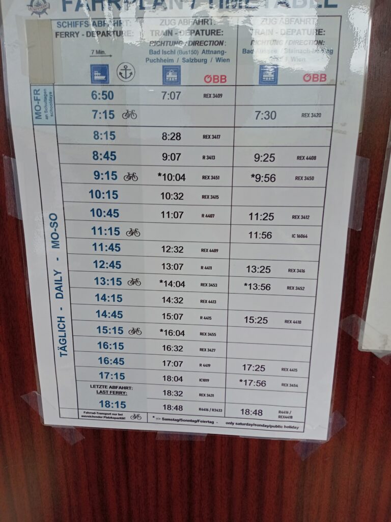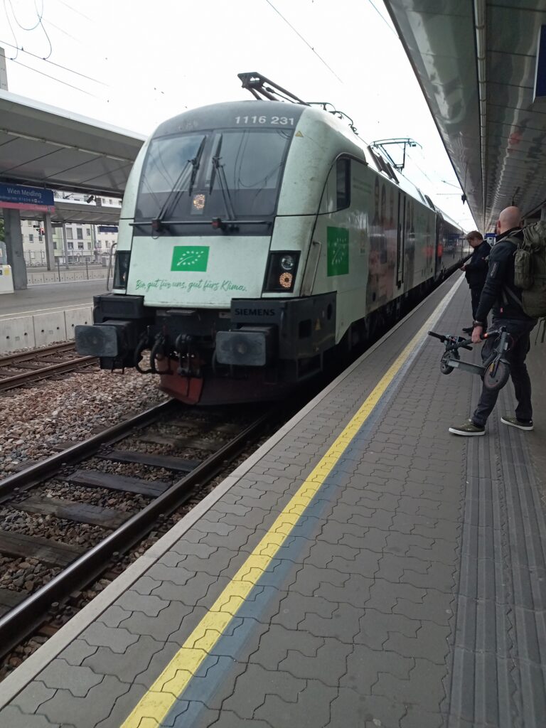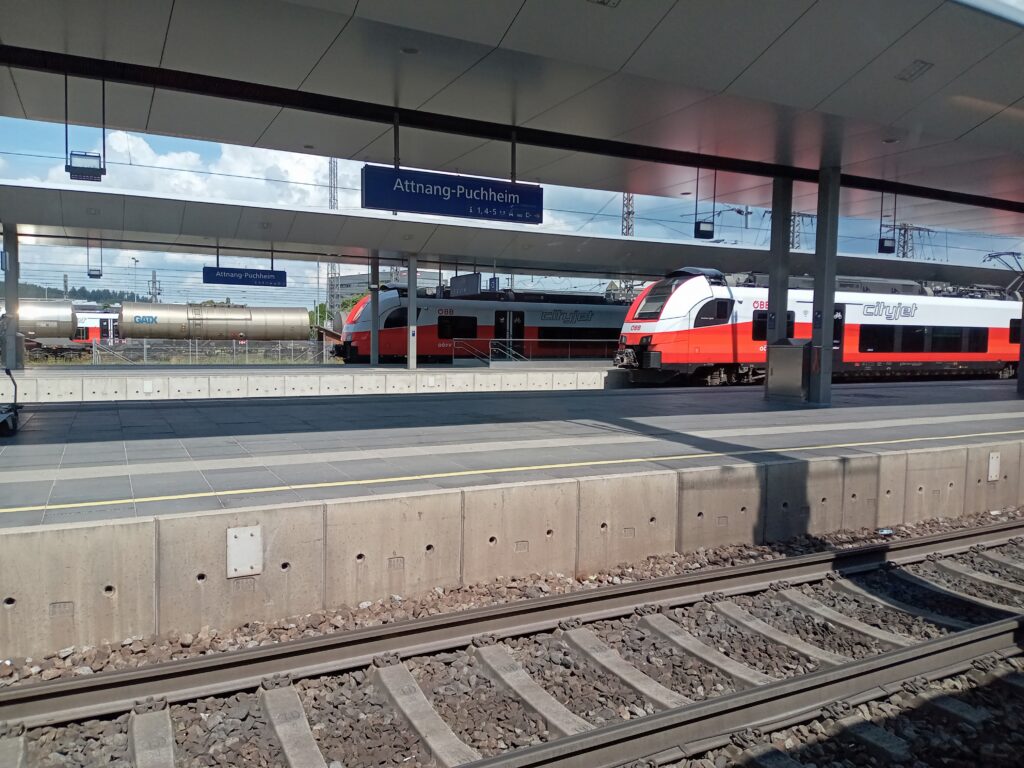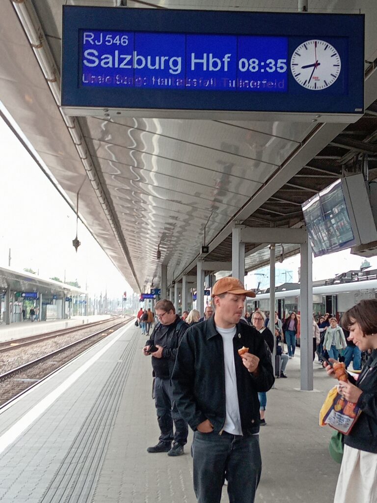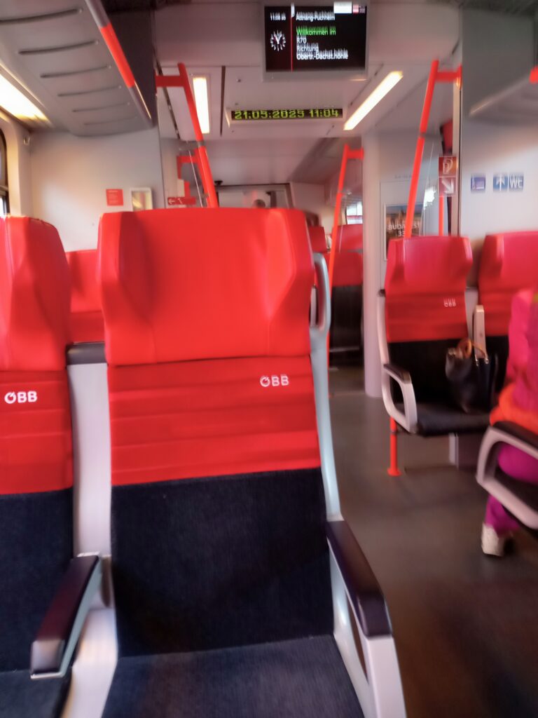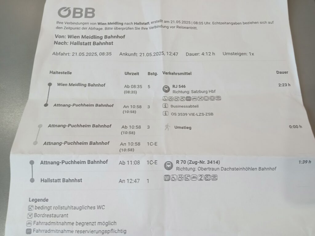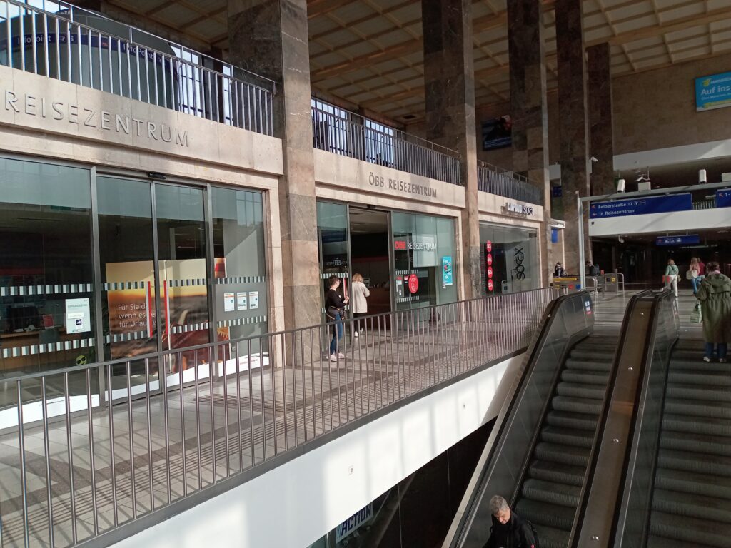 ウィーン西駅から8:45のOBBの列車に乗車の予定でしたが、乗るホームを確認しようとしたところ運休(工事のため)!!!!あわてて、窓口に行って「キャンセル⁇」と聞くと「Yes」と言われました……。すると、地図と乗換案内の紙を渡され、8:35にウィーン・マイドリンク駅から、アトナング・ブッフハイム駅経由で、しかも同じチケットで行けると言われました。マイドリンク駅は西駅から地下鉄で数分。慌てて地下鉄に乗って移動します。余裕をもって行動していたから間に合ったものの、あと10分くらい気づくのが遅れたら間に合ってなかったと思います。