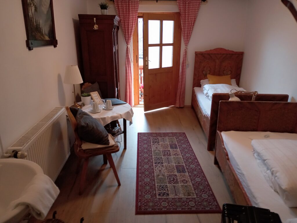 まずは、中心の広場を抜けたところにある本日の宿に行きます。早い時間ですが、チェックインを済ませることができたので、部屋に荷物を置きます。今回の宿は、カフェレストラン ツム ミュールバッハというところで、1階がカフェレストラン、2階より上が宿泊部屋となっています。部屋はもちろん綺麗、バルコニーからは湖を眺めることができます。また、中心部にあるため、いろんなところにアクセスしやすいです。ただ、ここは超人気観光地。今回の旅の中で、1泊の宿泊料金が最も高かったです。繁忙期は、さらに上がるとなると……。