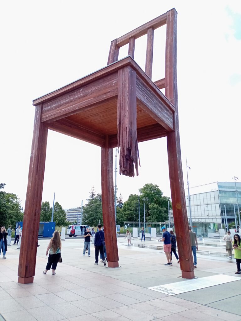 「壊れた椅子」は、1本脚が折れています。これは、地雷やクラスター爆弾への反対を象徴していて、この地を訪れる政治家へのメッセージとして製作されたそうです。