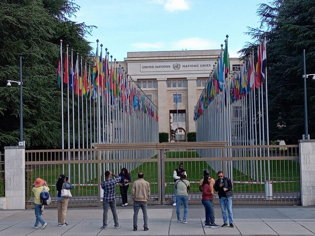 ジュネーヴは、フランスに囲まれ、国際機関が多くあり、会議も頻繁に行われることから国際的都市となっています。事実、フランス領から通っている人もいるらしいです。そんなことから、始めに向かったのは、国際連合ヨーロッパ本部のパレ・デ・ナシオン。トラムで移動すると、早速目に入るのは、「壊れた椅子」というモニュメント。