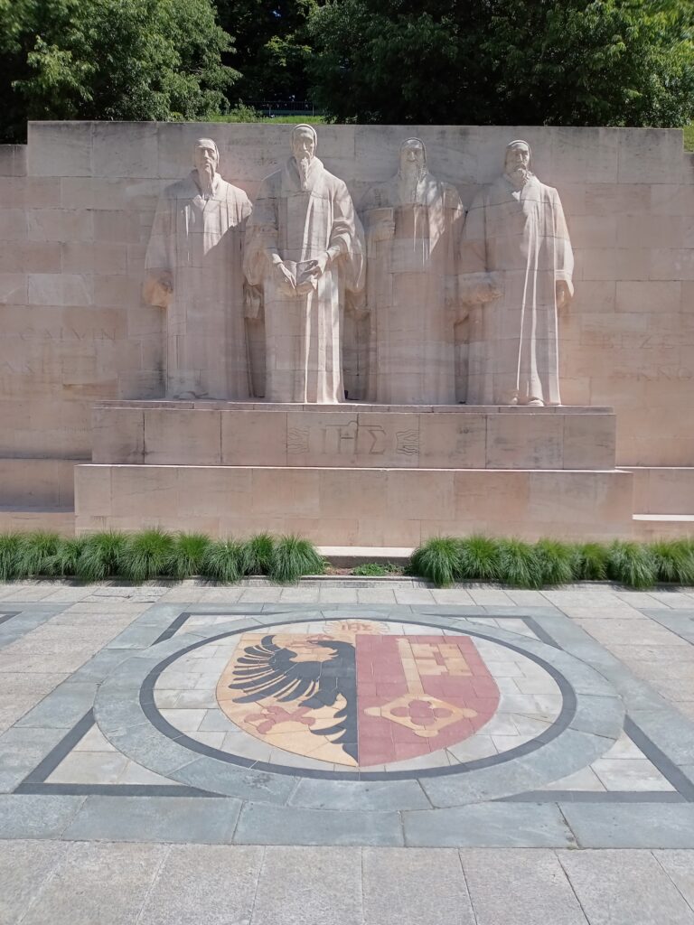 中心に戻って、今度はバスに乗り換え、旧市街へ。最初に宗教改革記念碑を訪れました。カルヴァン(左から2番目)をはじめ、宗教改革運動に貢献した人たちの像とエピソードを書いたレリーフが長さ100mにわたってあります。