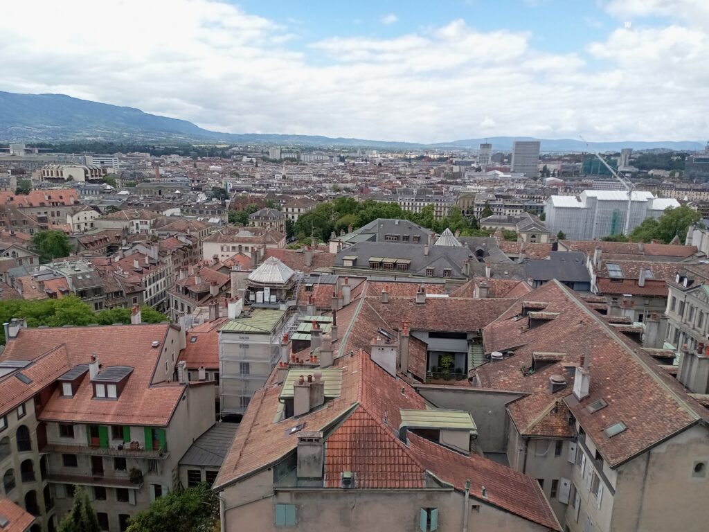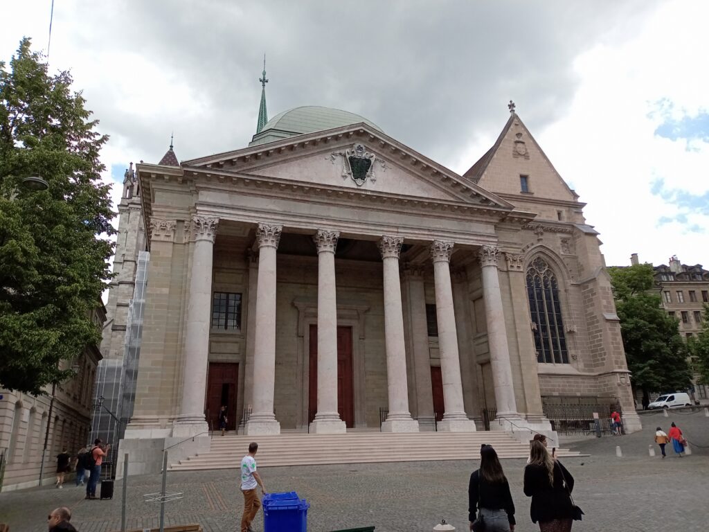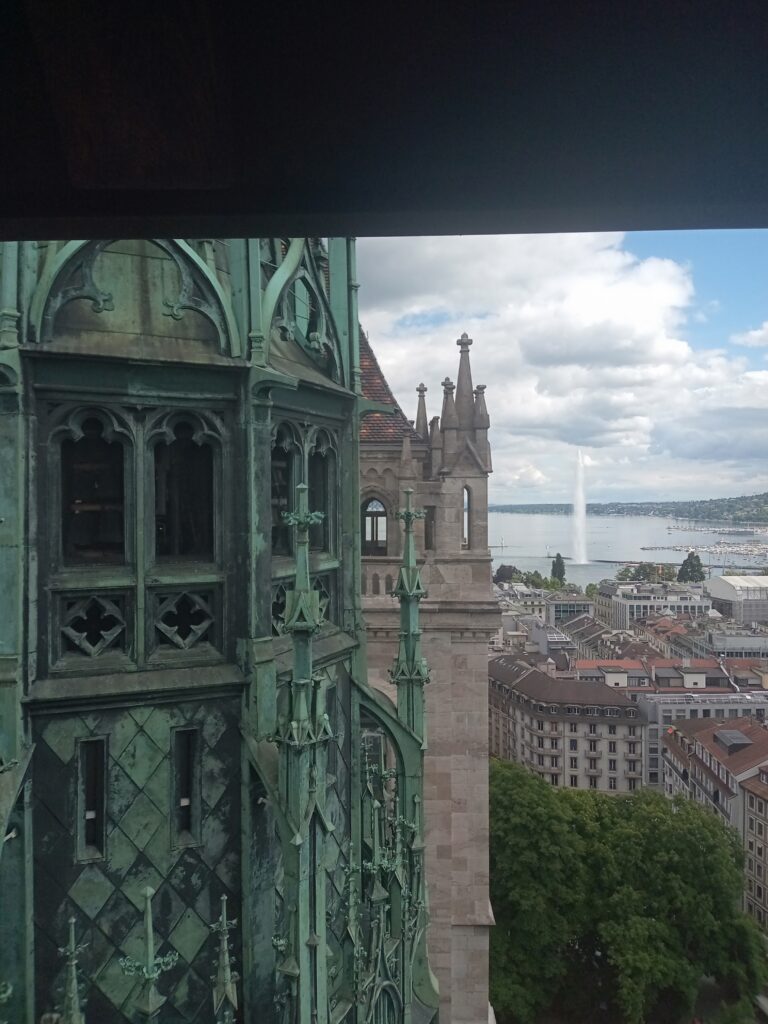 続いては、カルヴァンも説教を行ったサン・ピエール大聖堂へ。中は無料で、見られます。南北に2つの塔がありますが、こちらは有料(7スイスフラン)で上がれます。ジュネーヴ市街と、象徴となるレマン湖の大噴水も見られます。