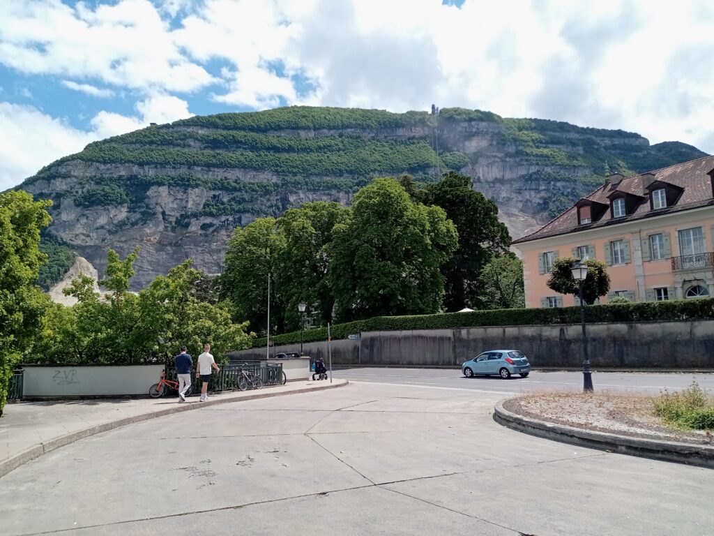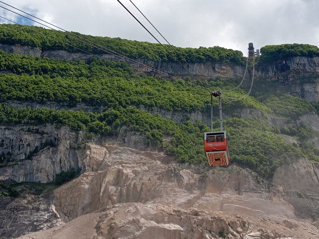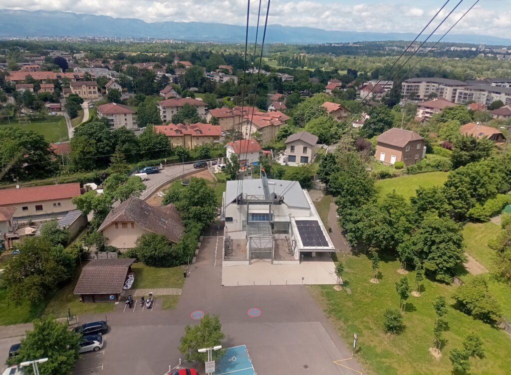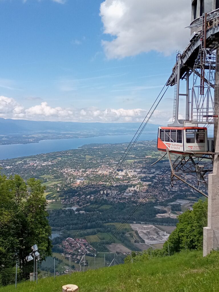 国境を越えたら目の前にサレーヴ山が見えます。10分くらい歩くと、ここの頂上に行くロープウェーがあるので、頂上の展望台へ。ここはフランスということで、ロープウェーはユーロです…。
