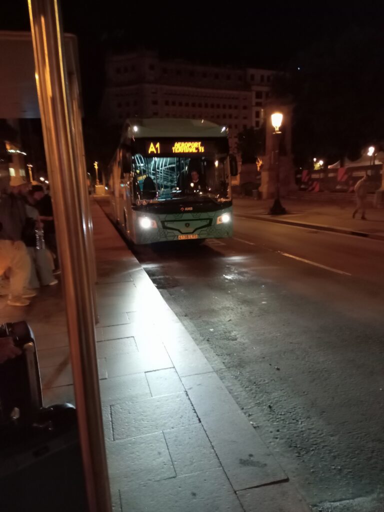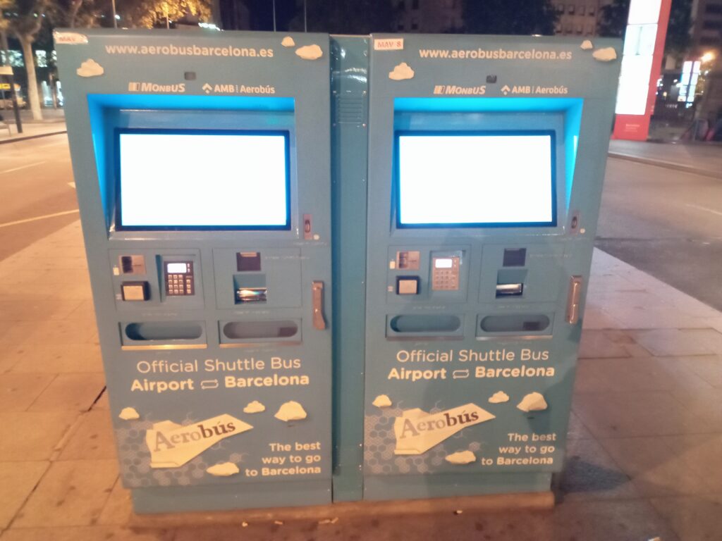 まずは、バルセロナの宿を朝の3:30前にチェックアウト。歩いて20分くらいのところにあるカタルーニャ広場から、バルセロナ空港行きのバスに乗ります。チケットは自動券売機で買います(片道7.45€)。