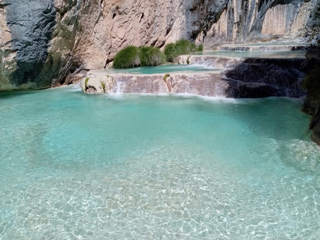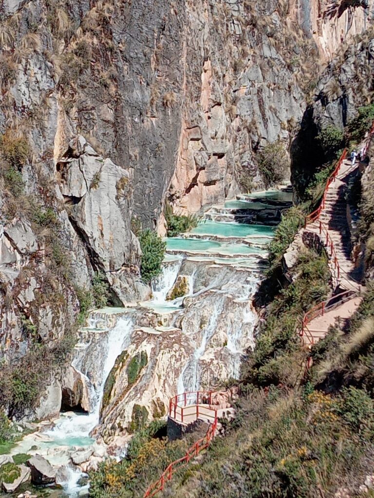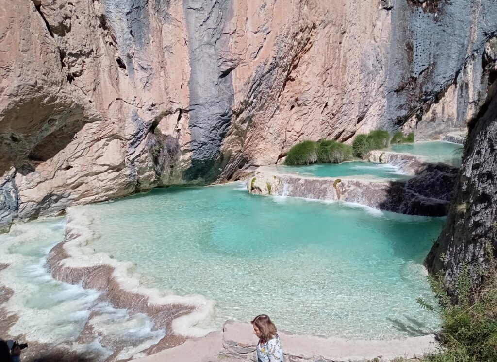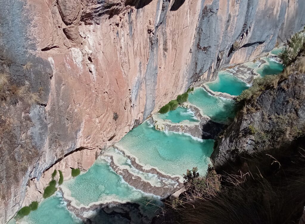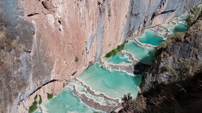 入口で15ソル(ガイド同行料含む)を払って入場し、まずは少し登ります。すると、すぐに絶景が見えてきます。断崖から見下ろすプールの青さがなんとも言えません。