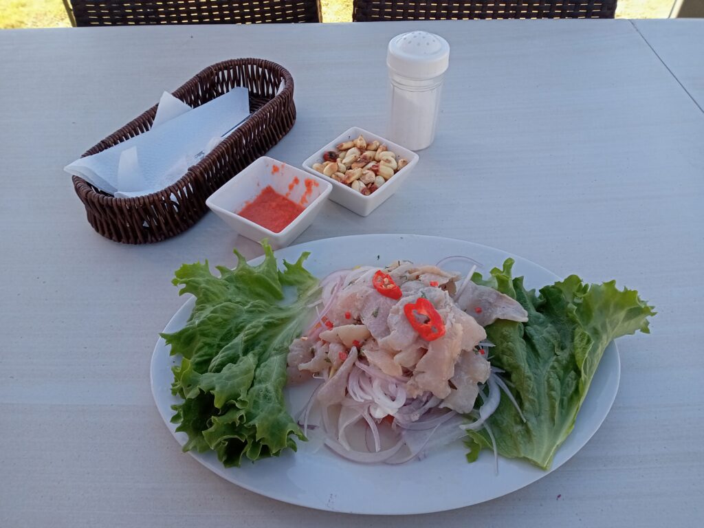 ここからは、来た道を戻り、最後はまた川沿いを歩いて入口へ。歩くペースはそれぞれなので、レストランに戻った人から昼食です。この地域では、鱒を養殖しているようで、鱒のセビーチェをいただきました(25ソル)。