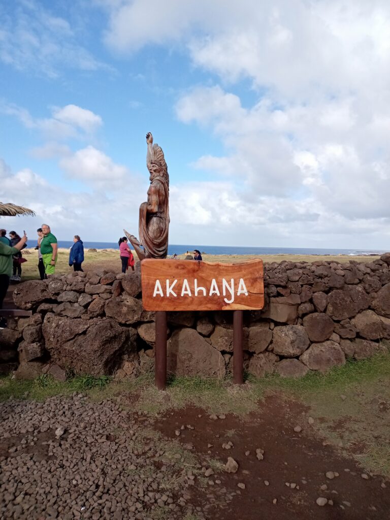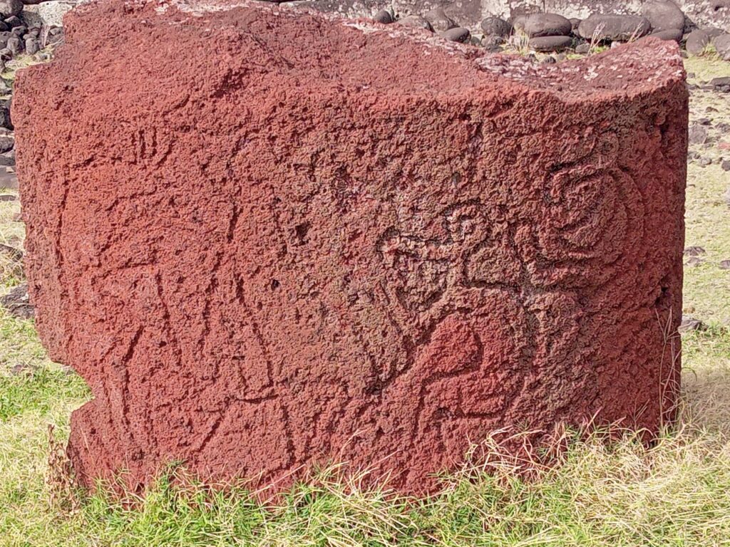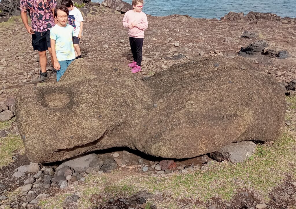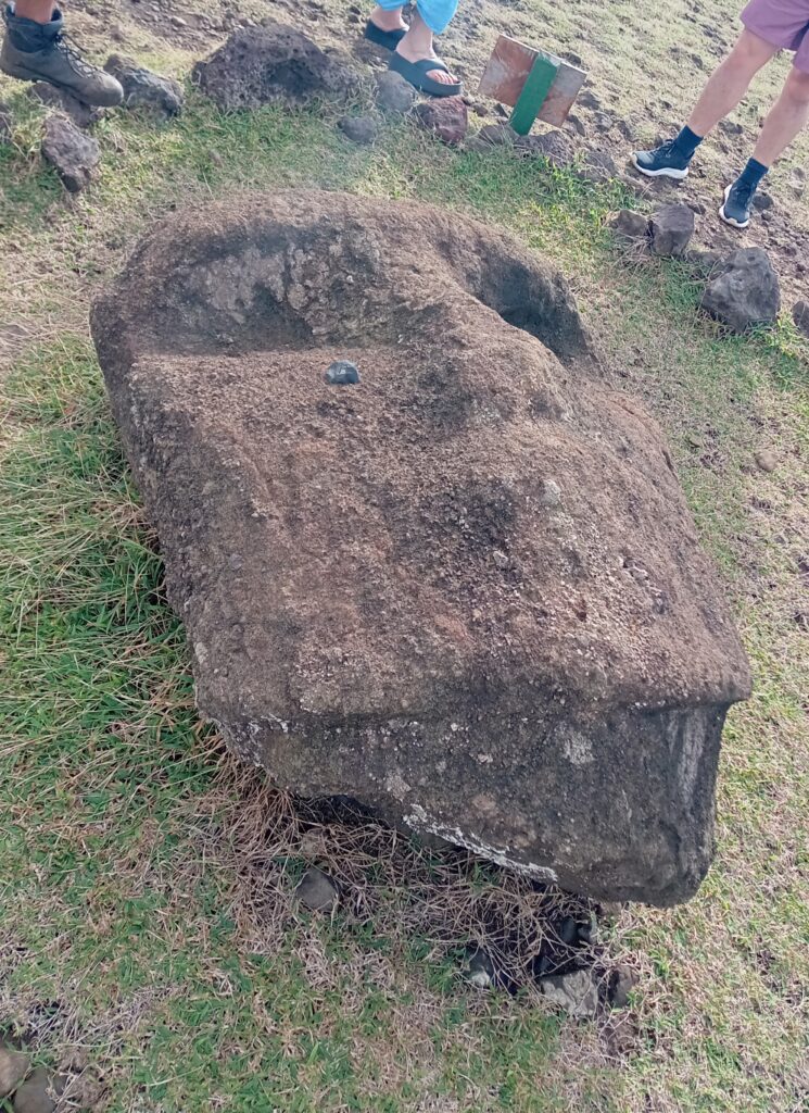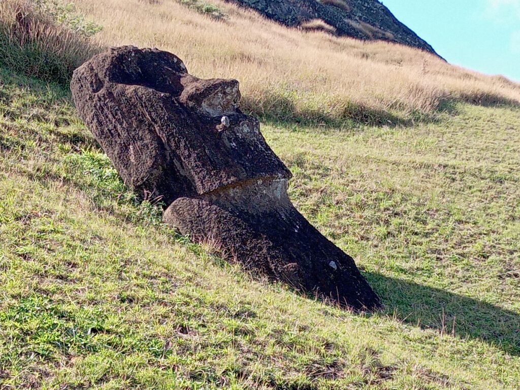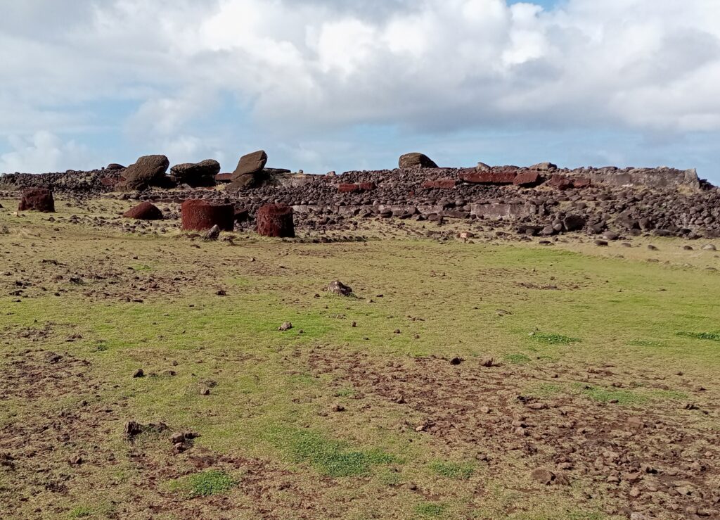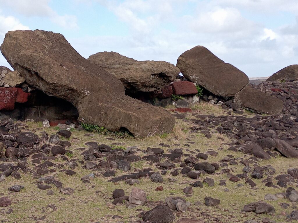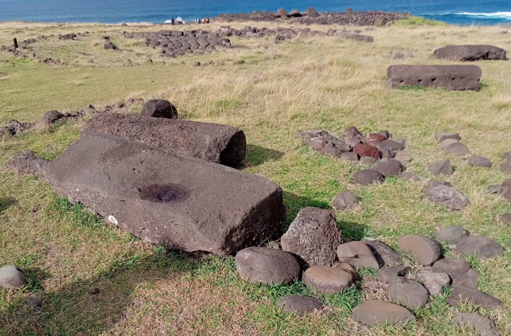 続いては、アフ・アカハンガ。モアイ倒し戦争の激戦地だったらしく、あちこちに倒れたモアイ像やプカオがあります。モアイの目には霊力(マナ)が宿ると信じられていたので、顔が見えないようにうつぶせに倒され、目は粉々に砕かれたそうです。