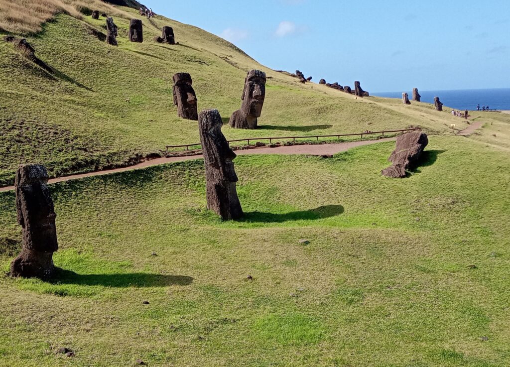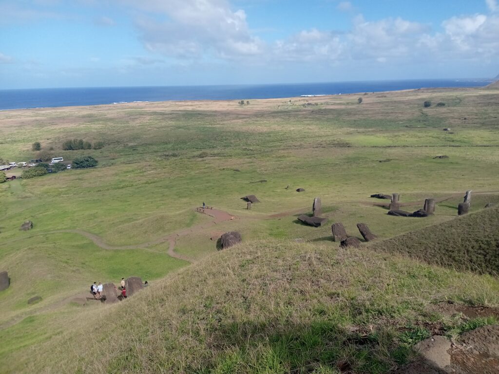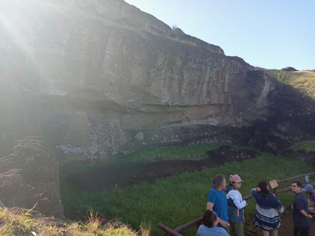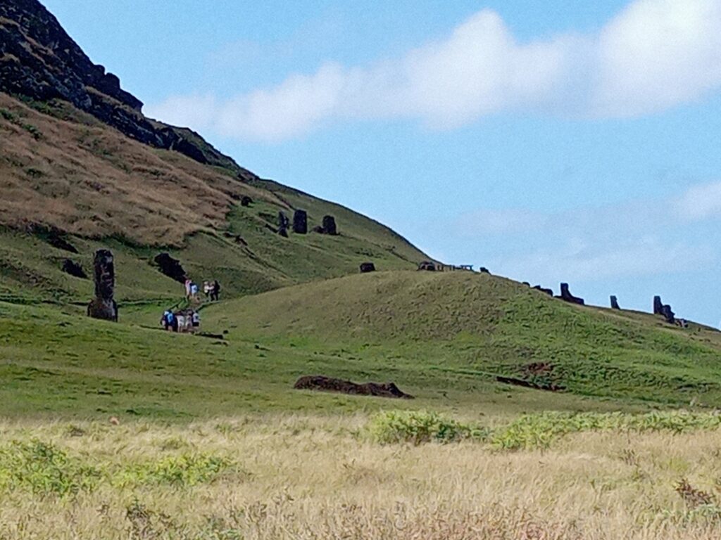 続いては、午前(ほぼ昼ですが)のハイライトであるラノ・ララクへ。ここの火山の麓は、かつてのモアイの製作工場です。ここには、制作途中や運ぶ途中、または失敗作のモアイ像などが約400体もあります。触ったり、遊歩道から外れることはできませんが、間近に見ることができます。