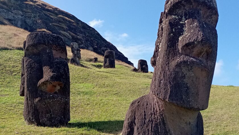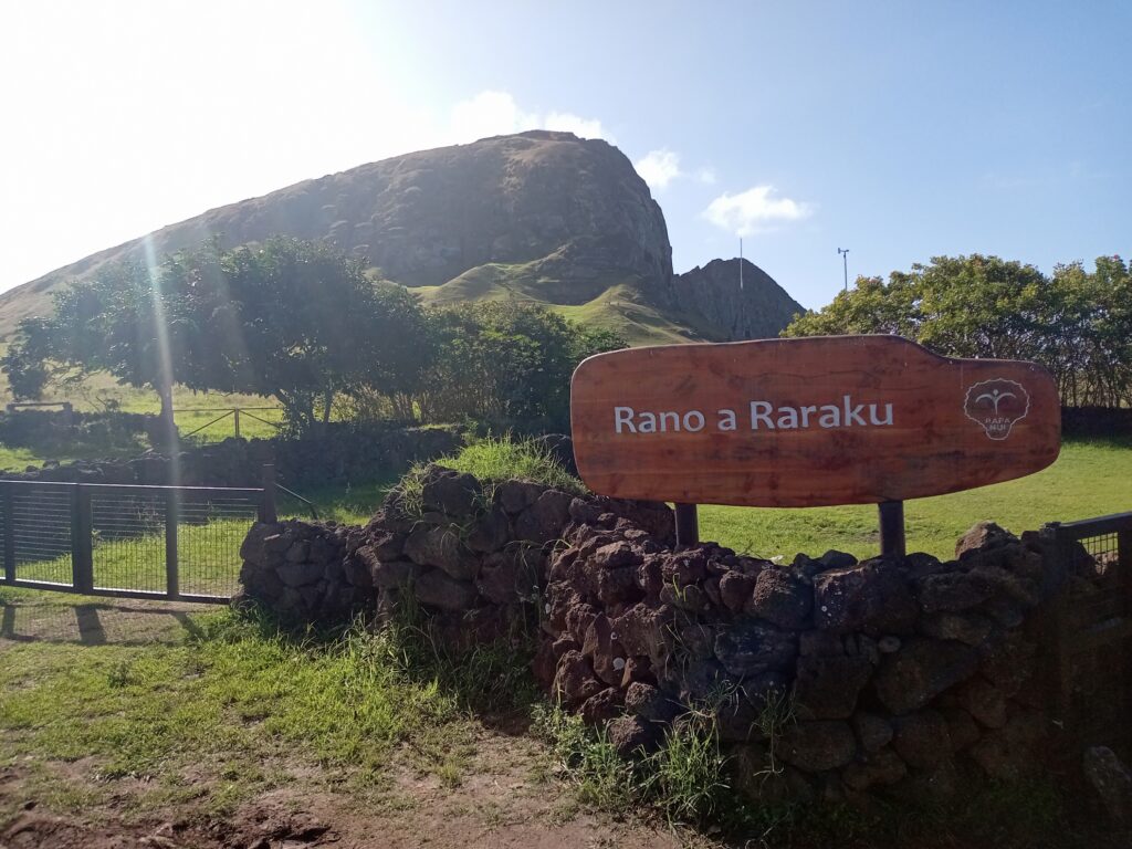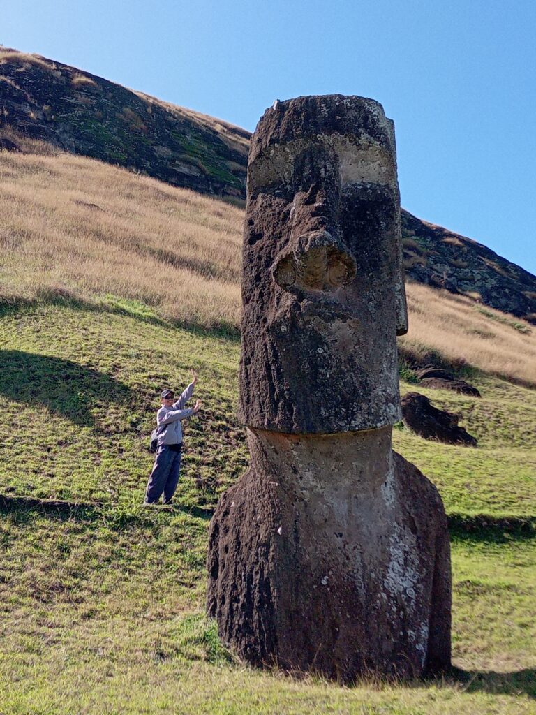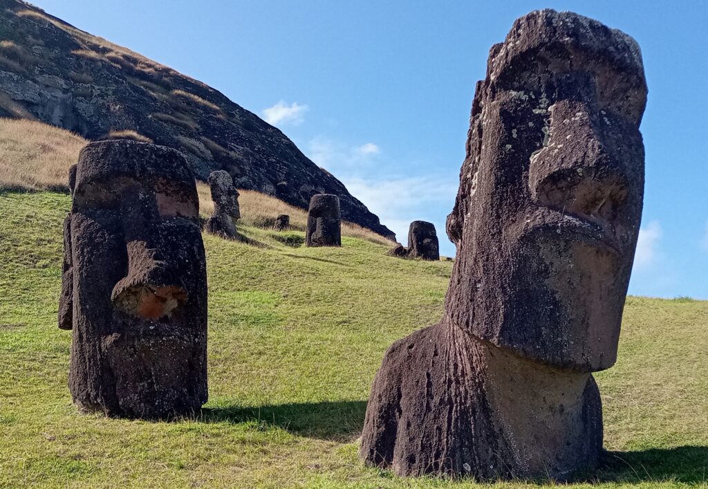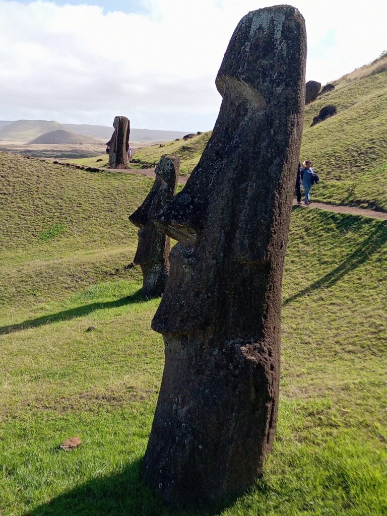 続いては、午前(ほぼ昼ですが)のハイライトであるラノ・ララクへ。ここの火山の麓は、かつてのモアイの製作工場です。ここには、制作途中や運ぶ途中、または失敗作のモアイ像などが約400体もあります。触ったり、遊歩道から外れることはできませんが、間近に見ることができます。