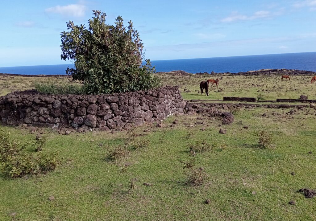 続いて向かったのは、「アフ・テ・ペウ」。古代の儀式用の台座の跡や洞窟などがありました。ガイドの説明を聞き、比較的平坦な道を馬や牛の落とし物に気を付けながら先に進みます。
