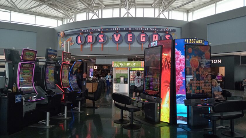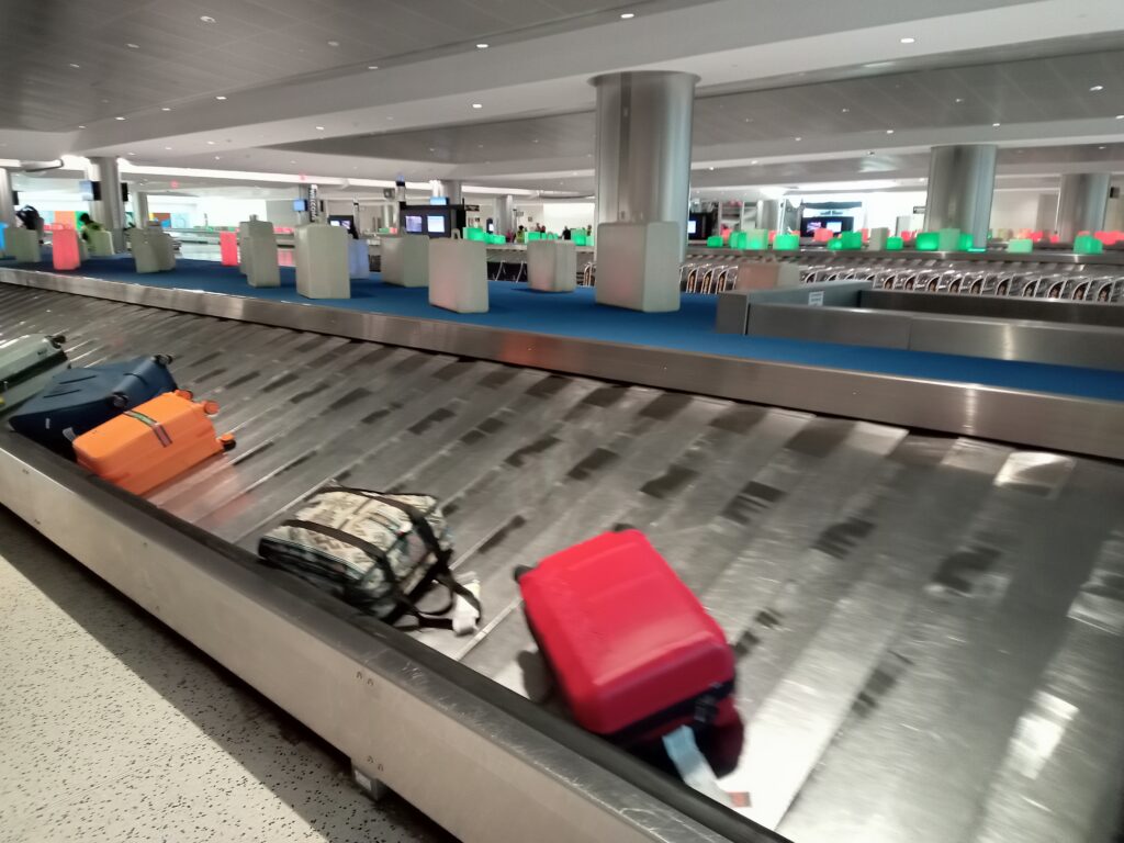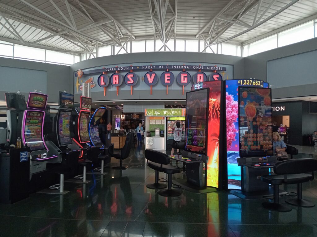 ラスベガスの空港に到着し、ターミナルに入るとまさにラスベガスという景観が。スロットマシンがあちこちに置かれています(実際にできます)。とりあえず、いろいろ目に入りますが、荷物を取りに移動します。