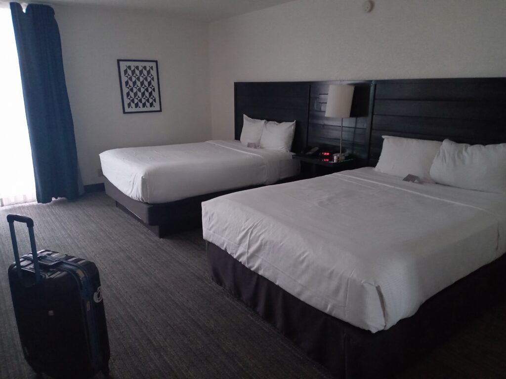チェックイン時刻が近づいてきたら、初めてUberで送迎を手配し、ホテルへ。空港からすぐのところにある今回のホテルは、OYO Hotel & Casino Las Vegasというところです。3泊する予定でしたが、清掃がちゃんとされていない、エレベーターのほとんどが壊れているなど、とにかく口コミの評価がよろしくないので不安な気持ちを抱えながらチェックインへ。1階は、受付とカジノ、レストランやBARなどになっています。受付や部屋については特に問題なかったです。エレベーターも滞在中は壊れてなかったです。受付やカジノのスタッフも親切で気になることはありませんでした。