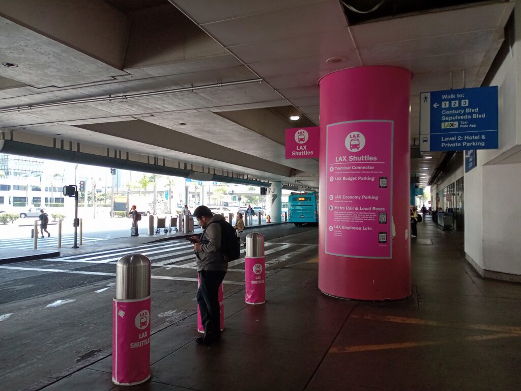 空港から宿までは、トラムレイルと徒歩で行きます。空港からトラムレイルの駅までは、無料のシャトルが出ています。ピンクの柱のところで待てばいいので、わかりやすいと思います。