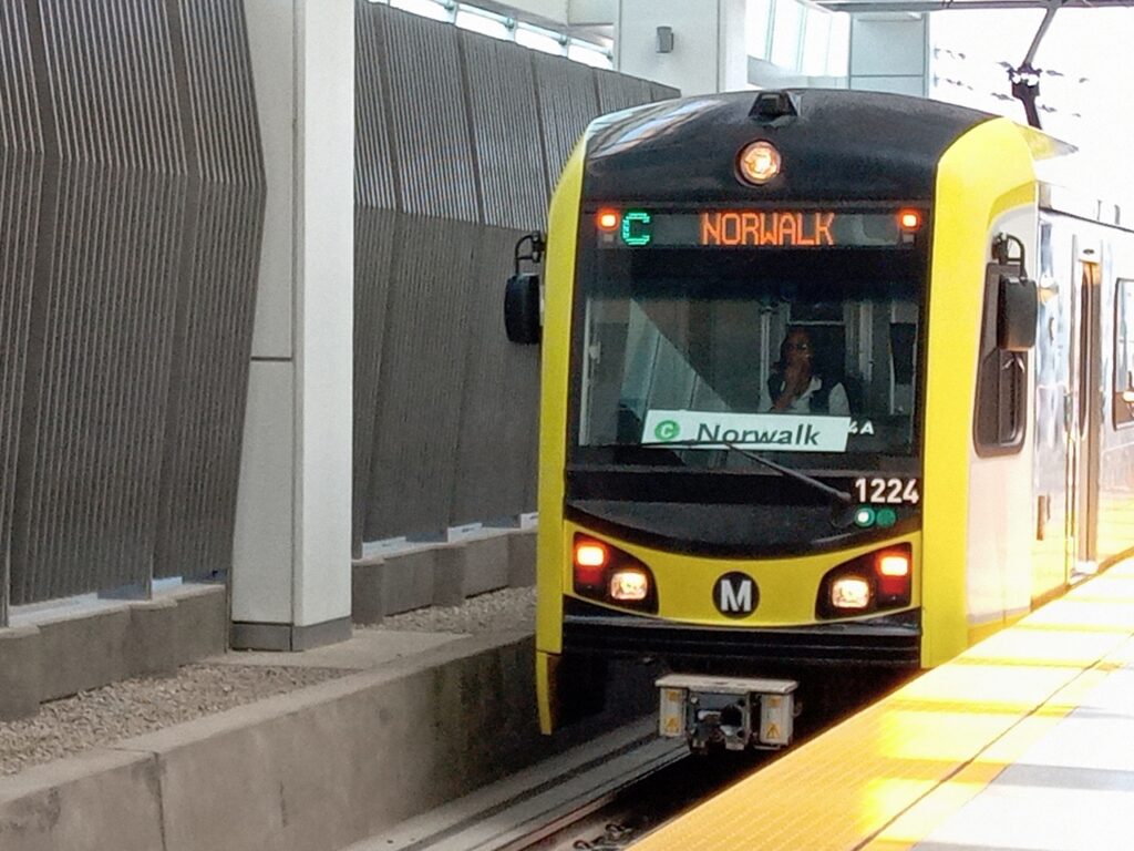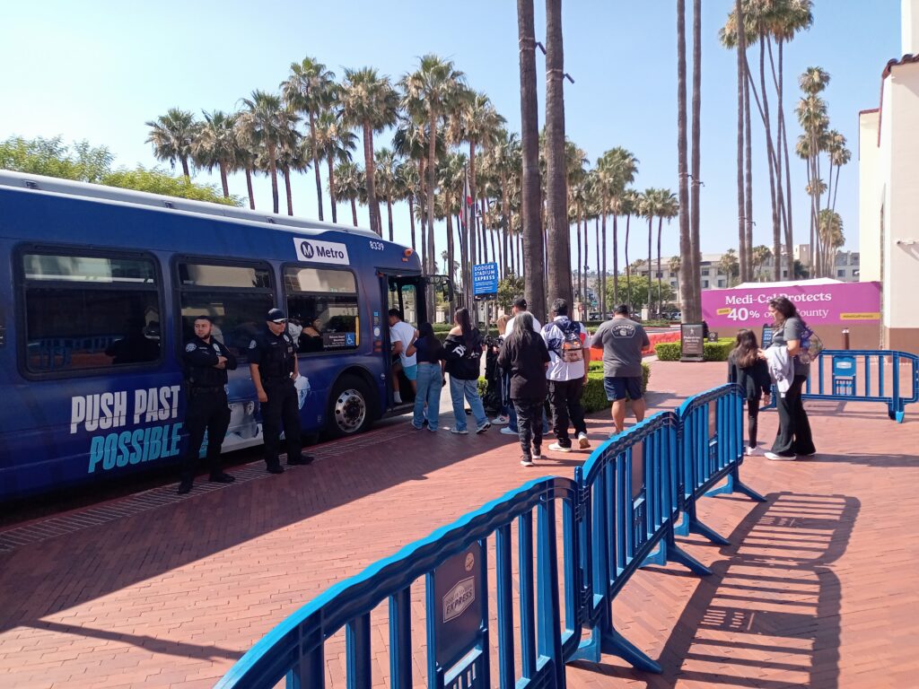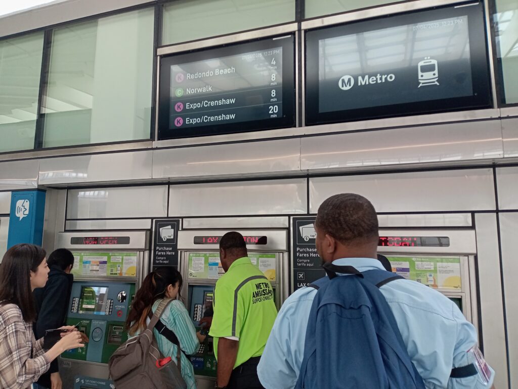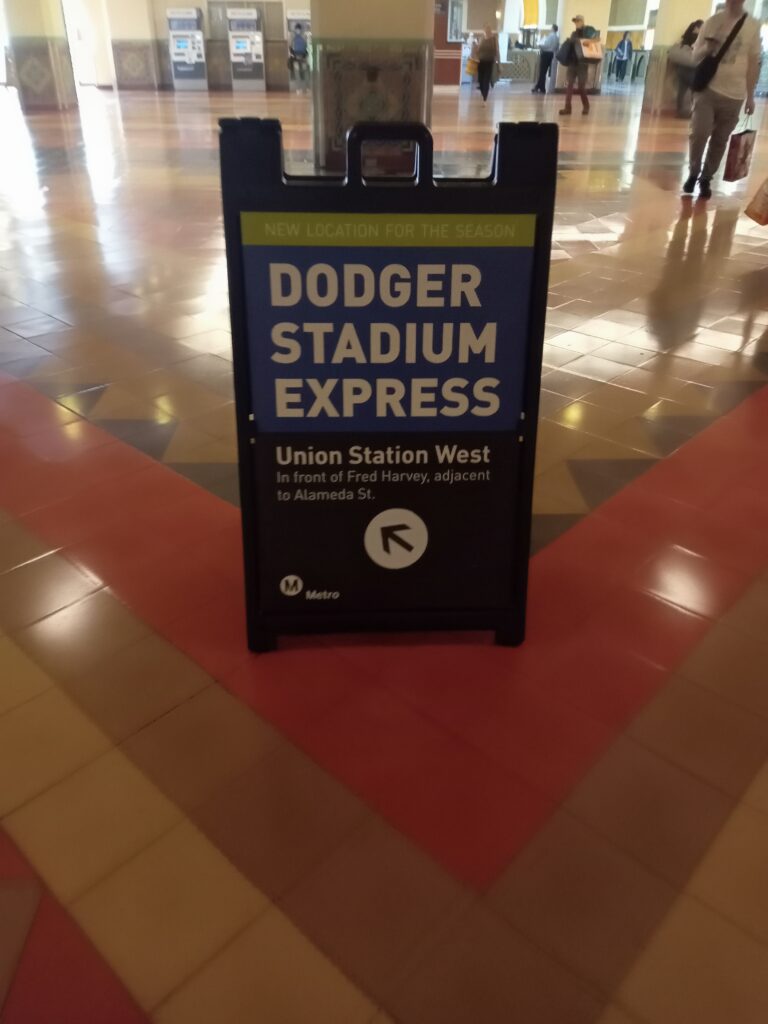 気を取り直して、ドジャースタジアムへと向かいます。スタジアムへは、まずは、トラムレイルでユニオン駅というところへ行きます。ユニオン駅からは、ドジャースタジアムへの無料シャトル(ドジャースタジアムエクスプレス)が出ています。駅の出口からは、表示もあるので迷うことはありません。