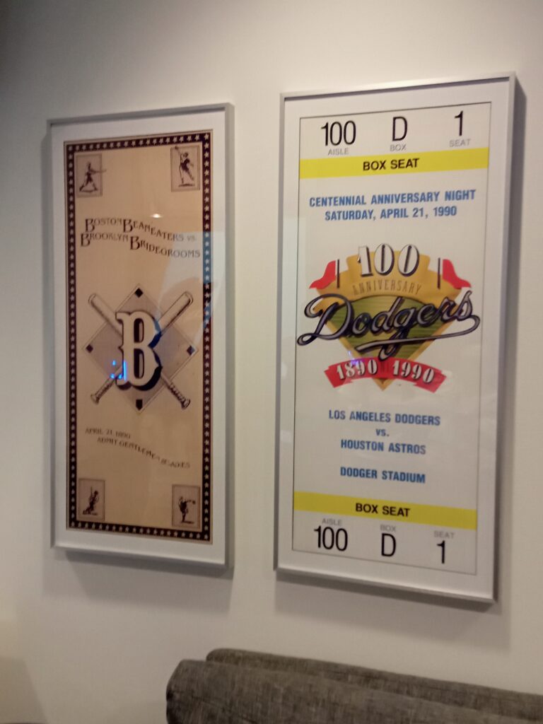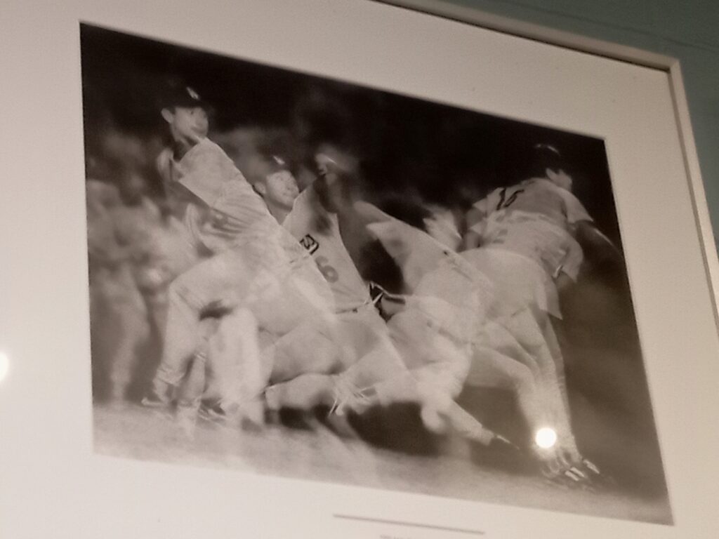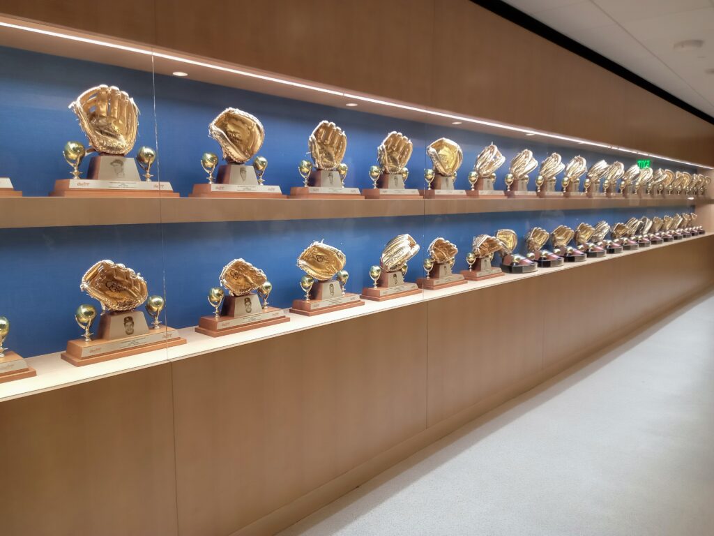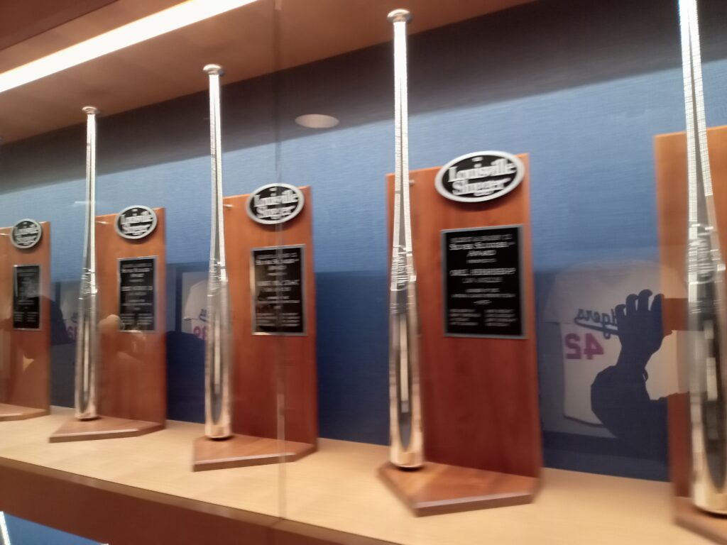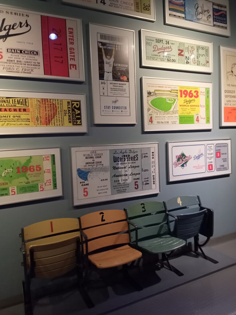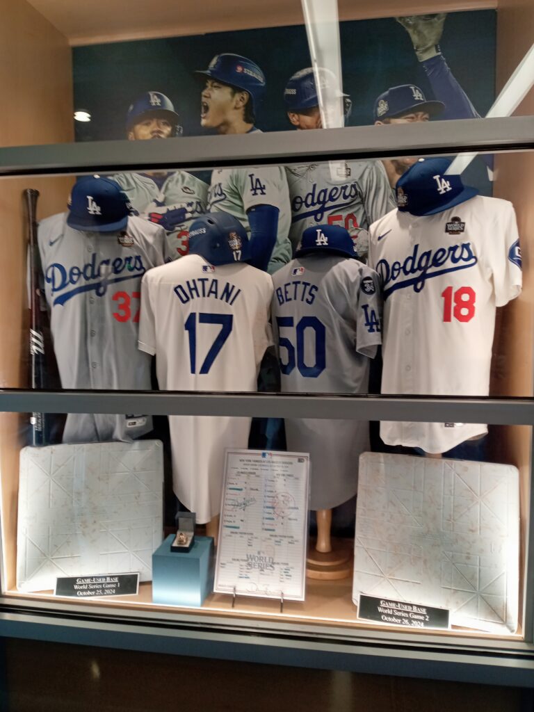 そして、ガイドについて行きスタジアムの中やクラブハウスの手前などを案内してもらいます。昔のパネルや過去に在籍した選手の写真やパネル、2024年のワールドシリーズで選手が使ったものなどを見学することができました。