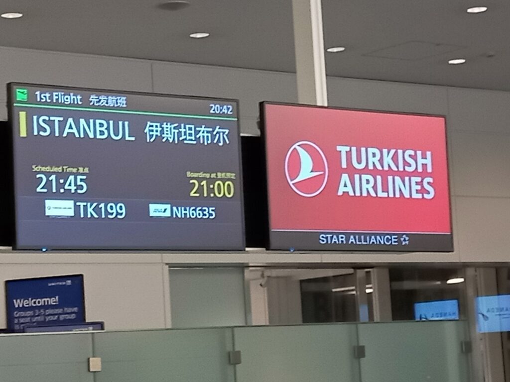 集合時刻となり、団体受付カウンターで添乗員さんに挨拶。その後、利用するターキッシュエアラインのカウンターで手続きを済ませて、保安検査を抜けます。今回は、18名でのツアーでしたが、自分を含め半数近くの8名が1人での参加でした。