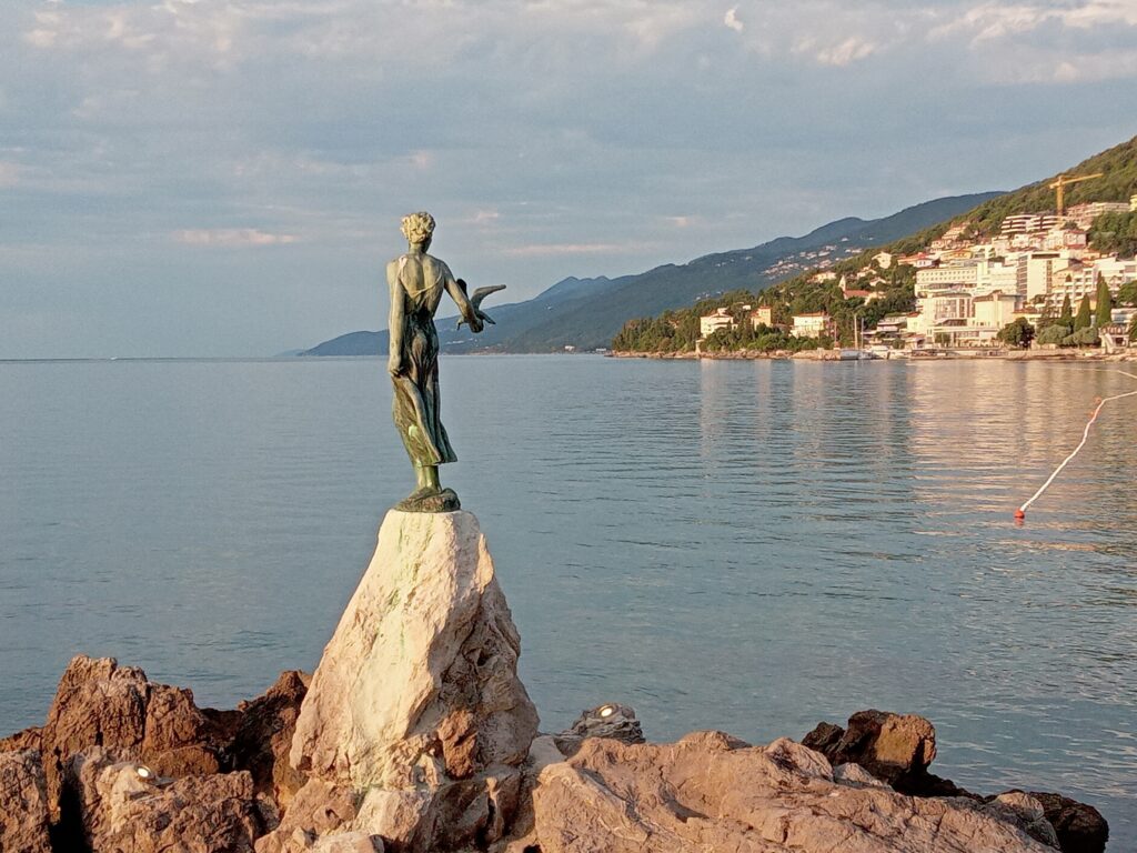 ちなみに翌朝、朝食前に海岸沿いを散歩しました。人気の海辺の遊歩道はフランツ・ヨーゼフ1世遊歩道(ルンゴマーレ遊歩道)。途中にある乙女とカモメの像は記念撮影のスポットで、朝から観光客が訪れていました。また、ホテル沿いの海では、朝から海水浴をしたり、日光浴をしたりする人もいました。
