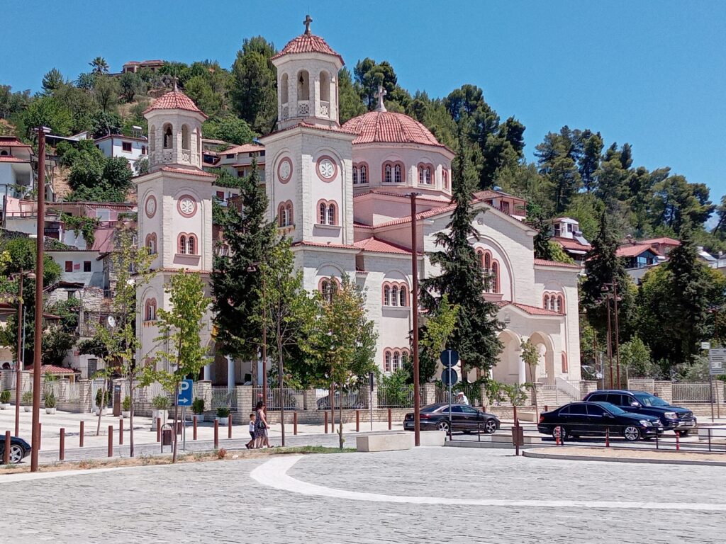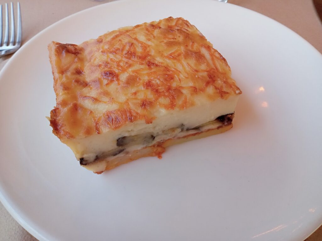 市街地に降りたら、まずは近くのレストランで昼食です。この日はマッシュポテトとナス、ひき肉などを層になるように重ねてオーブンで焼いたムサカ(スープ付き)というものをいただきました。