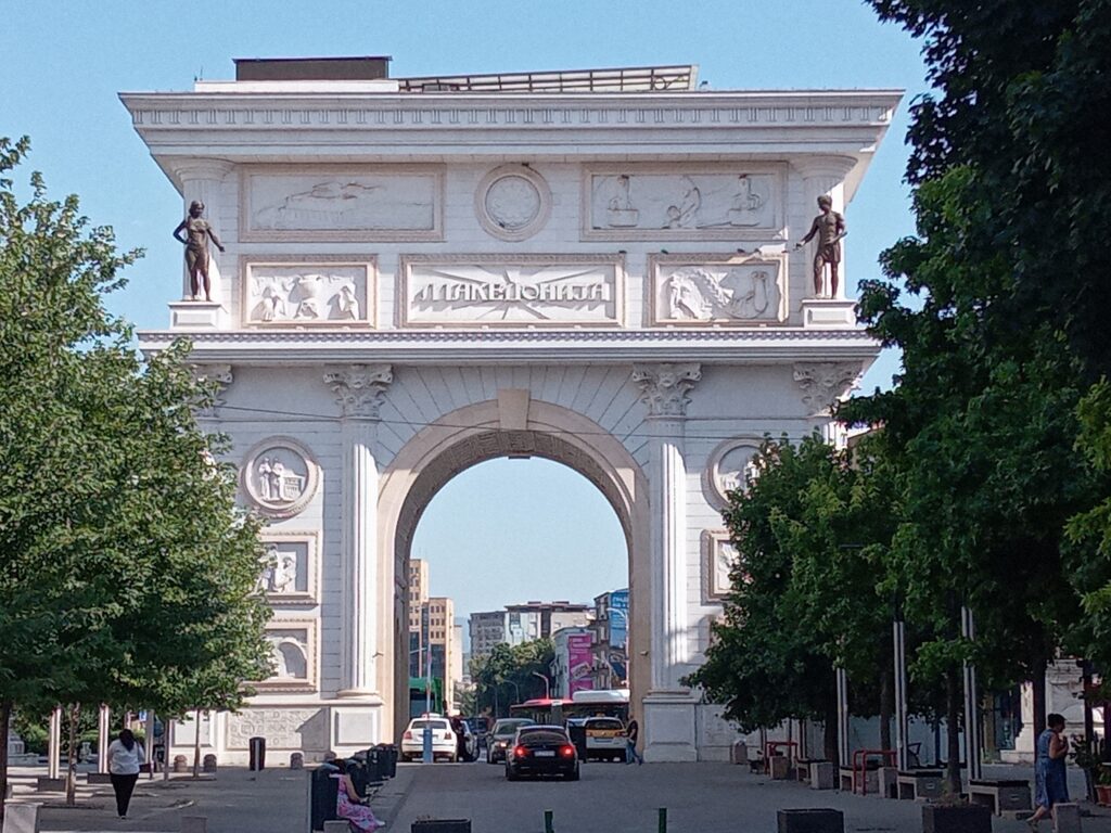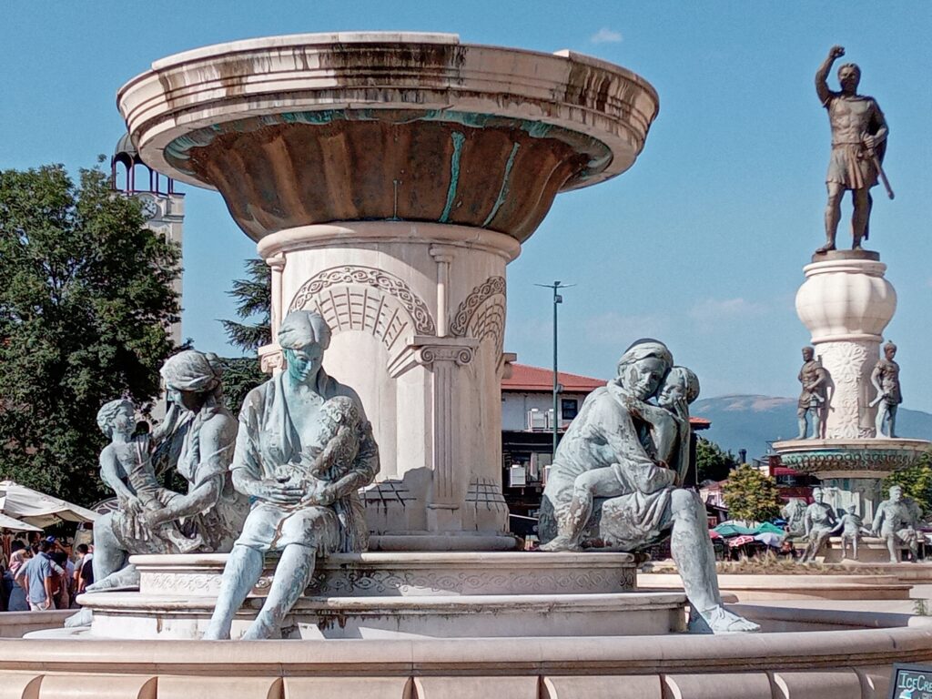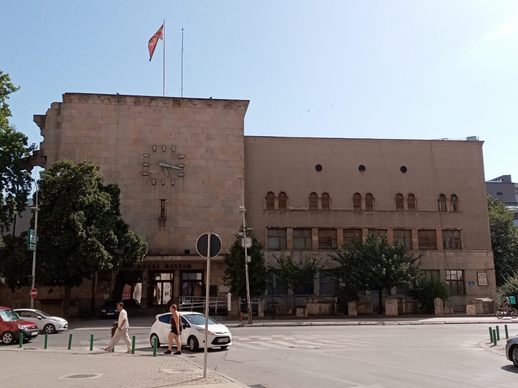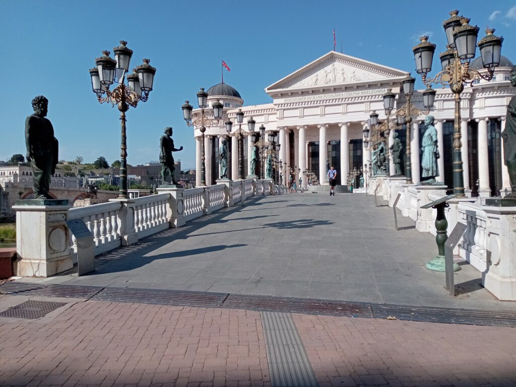 スコピエに着き、バスから降りるとたしかにとんでもない暑さです。バスを降りたのは、博物館の近くです。スコピエ博物館は、1963年に起きた大地震で半壊した旧鉄道駅を利用して作られた博物館です。スコピエから発掘されたコインや装身具、彫刻などが展示され、見ごたえたっぷりの博物館だそうですが、ここは外観だけで、マケドニア広場を目指して歩きます。