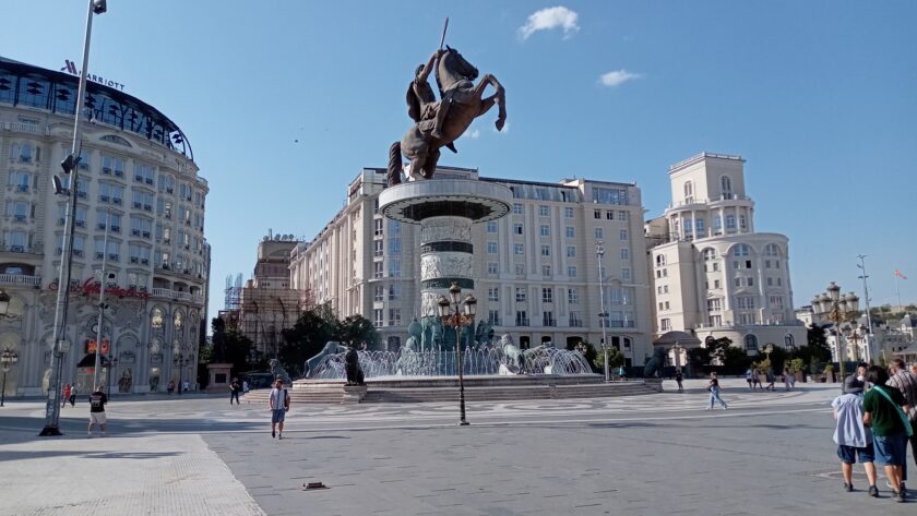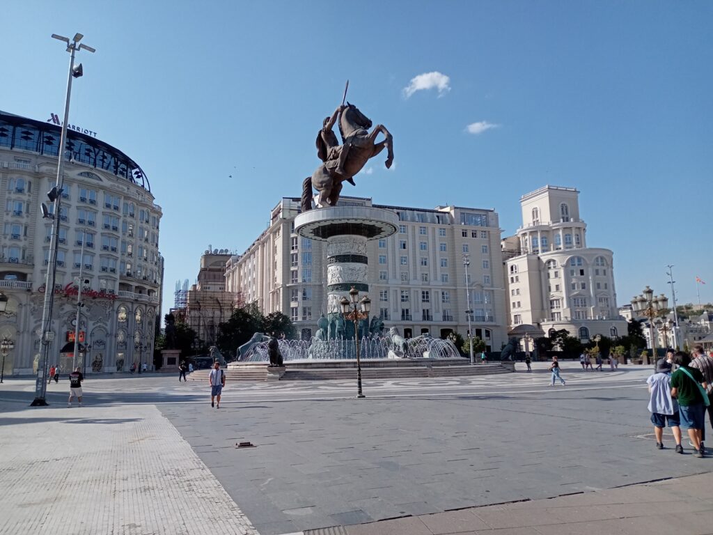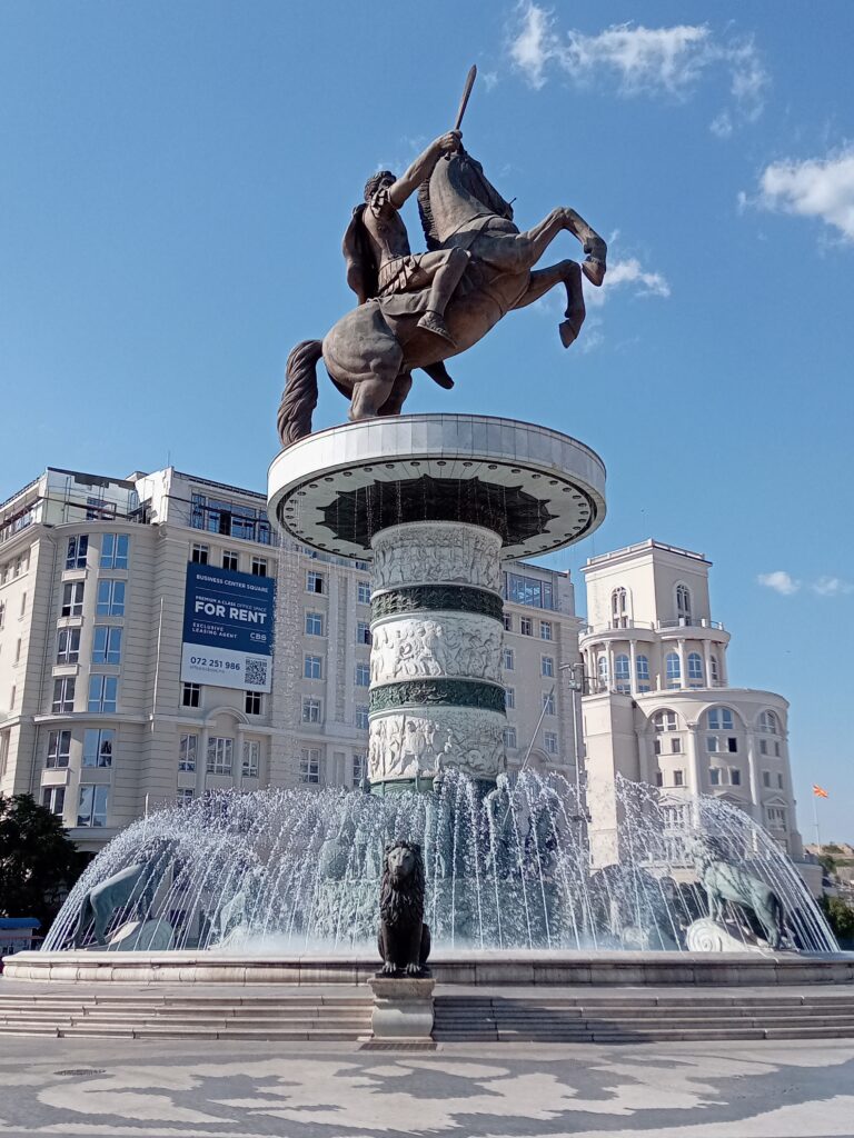 そして、新市街の中心にあるマケドニア広場へ。中央には馬に乗るアレキサンダー大王の銅像があり、撮影スポットになっています。台座をあわせると約25mという大きな像で、足元には噴水と8頭のライオンがいます。周辺には店やカフェ、大きな建物が立ち並んでいます。