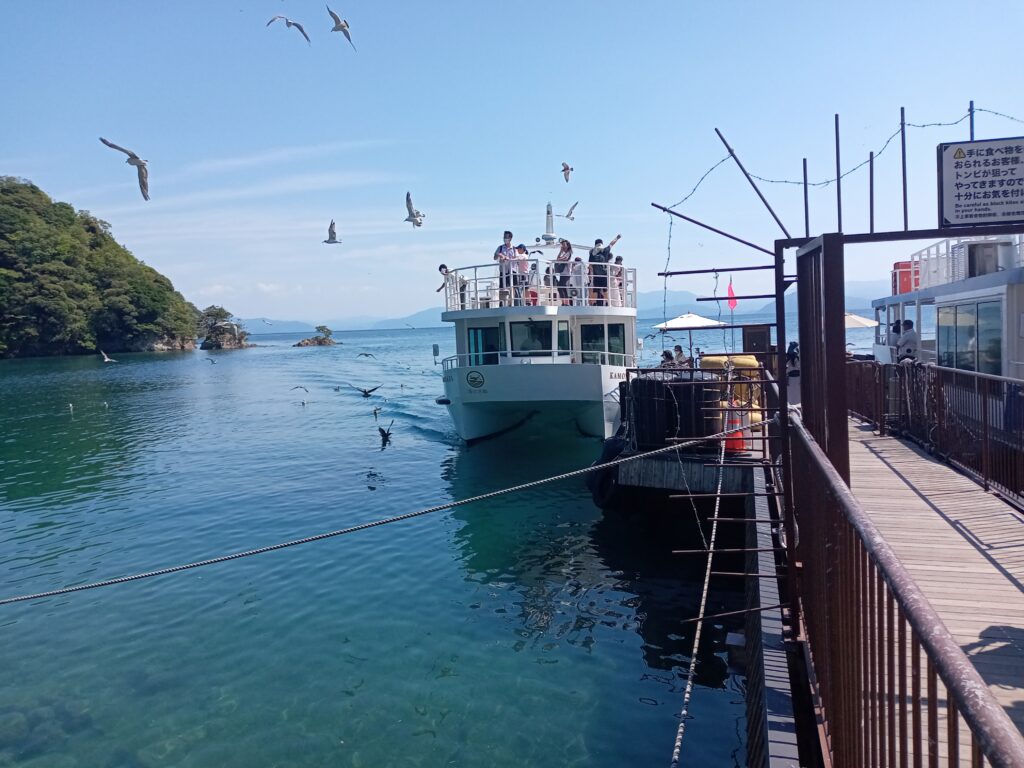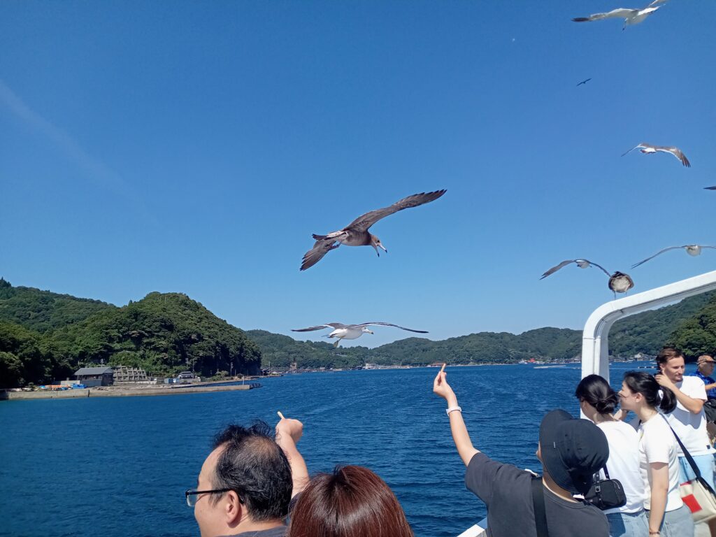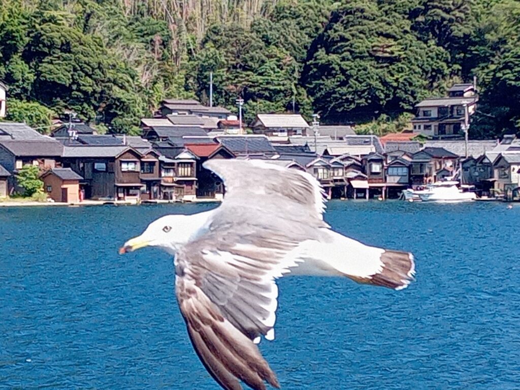 天気にも恵まれ、きれいな湾を進んでいきますが、舟屋よりも遊覧船を囲む鳥の数がとんでもない!?鳥が狙っているのは遊覧船の乗船客が放り投げる餌です(乗船前に買い求めることができます)。この餌を求めて四方八方から鳥が飛んできます。乗客も最初のうちは喜んで撮影したり、餌をあげたりしていたのですが、ここに来る鳥は人に慣れていて、直接餌を渡せるくらい至近距離を飛んでいきます。舟屋よりも鳥に興味をもっていかれます。