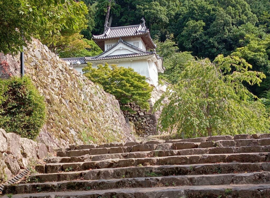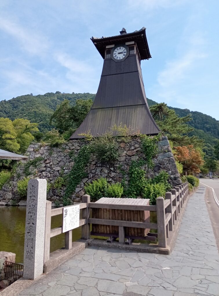 出石は、江戸時代には城下町として栄えた歴史エリアで、但馬の小京都と呼ばれています。公共駐車場に車を停めて歩きますが、この日も猛暑のため、暑すぎて歩いている人がほとんどいません。これは危険と思い、出石のシンボルである辰鼓楼と出石城跡に残る隅櫓だけ見ることにしました。