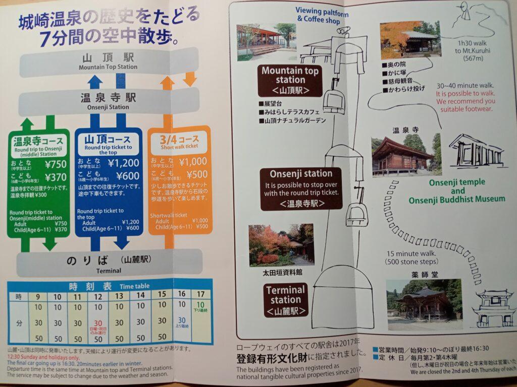 次の場所に行く前に、鴻の湯の近くにある、城崎温泉ロープウェーへ。山麓駅から途中の温泉寺駅を経由して山頂駅に行きます。目的によって、ロープウェー料金が異なるので、確認してから購入すると良いでしょう。自分は山頂から景色を見たかっただけなので、山頂コースを購入します。