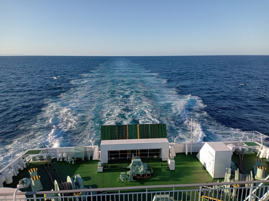 乗船時刻まで車内で待って、いよいよ乗り込みます。今回は2等客室で移動しますが、移動時間を過ごす場所を探します。フリースペースはあまり広くなく、結局客室で寝たり、本を読んだりして過ごすことになりました。もう少し、自由に座れるスペースが欲しかったところです。日中の長時間フェリー移動は初めてだったので、デッキに上がり太平洋や近づく東北の地を眺めもしましたが、やはり時間を持て余した感じでした……。
