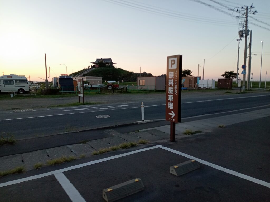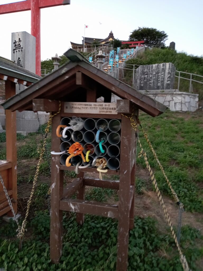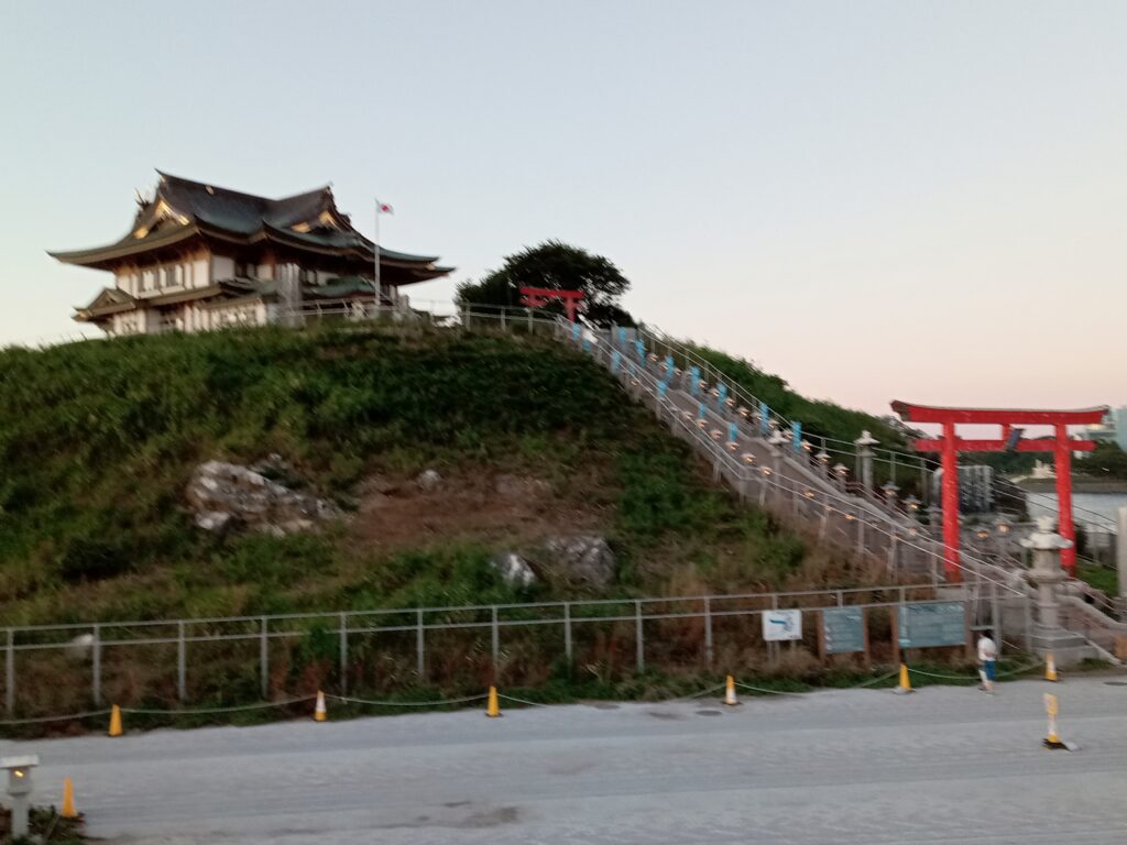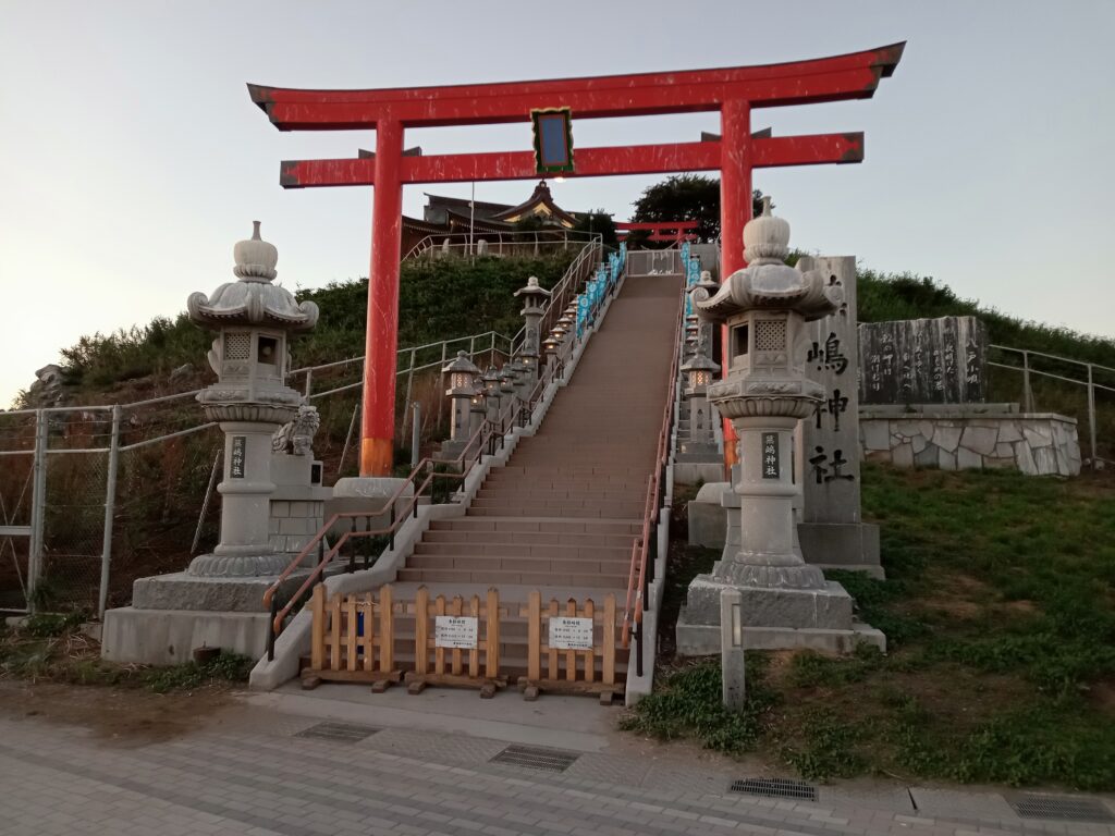 100mほど離れた物産館の駐車場に停めて、神社へと行きます。残念ながら参拝は17:30までだったので、下から拝むだけにしました。また、ここはウミネコの繁殖地としても有名ですが、こちらも姿は拝めませんでした。