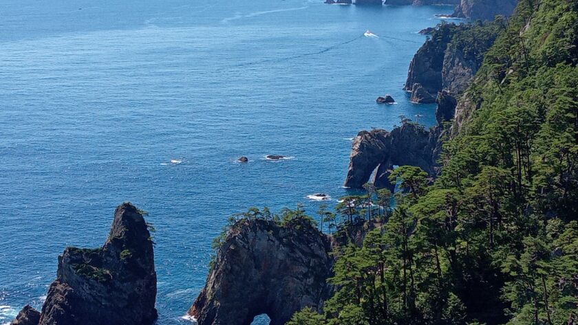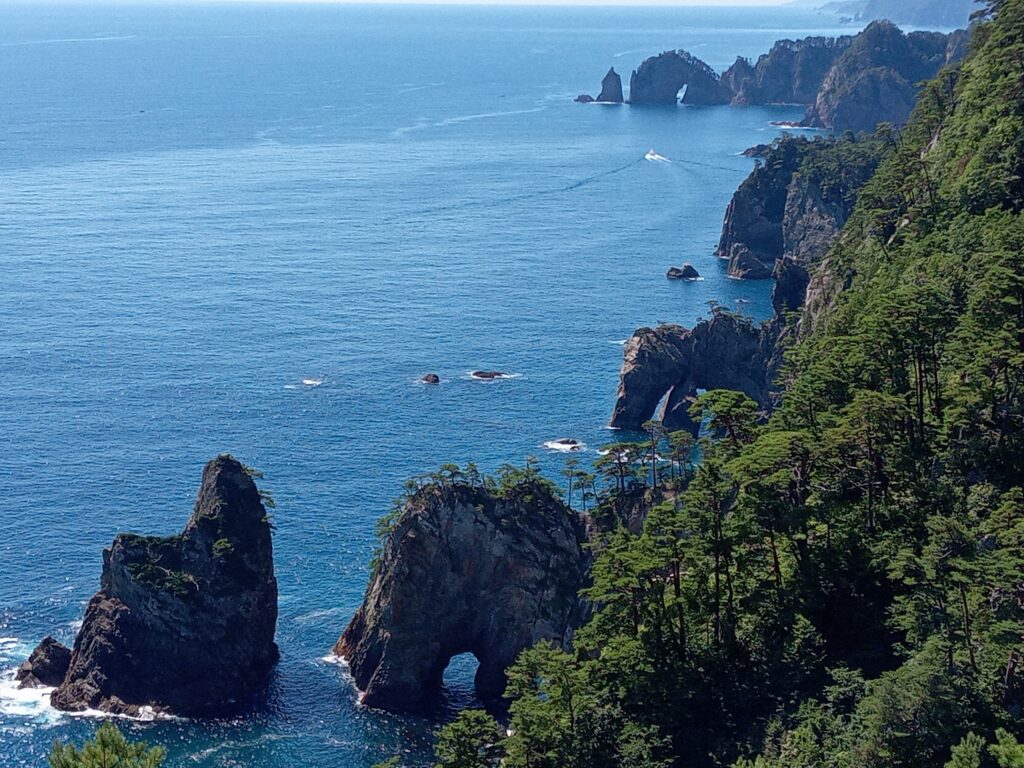 まず向かったのは、断崖が連なる北山崎。海面からの高さ200mの大海食崖が連なる景色は、日本交通公社全国観光資源評価の「自然資源・海岸の部」で唯一の特A級に格付けされているそうです。