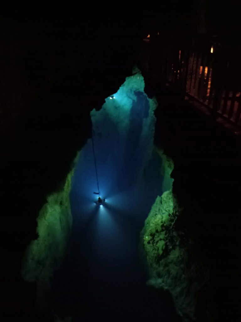 無料駐車場に車を停め、まずは龍泉洞内へ。今なお調査が続けられているそうで、全長は5000m以上とも言われています。観光コースは約700mほどですが、地底湖に見る「ドラゴンブルー」の青さは半端ではありません。