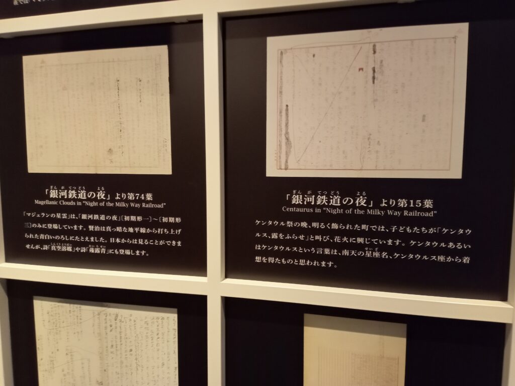 花巻に入って向かったのは、宮沢賢治記念館。ここでは、宮沢賢治の生涯はもちろん、その世界観や宇宙観を基に、展示が構成されています。賢治の愛用品、原稿などの展示に加えて、ビデオやスライド、図書資料などが充実していました。